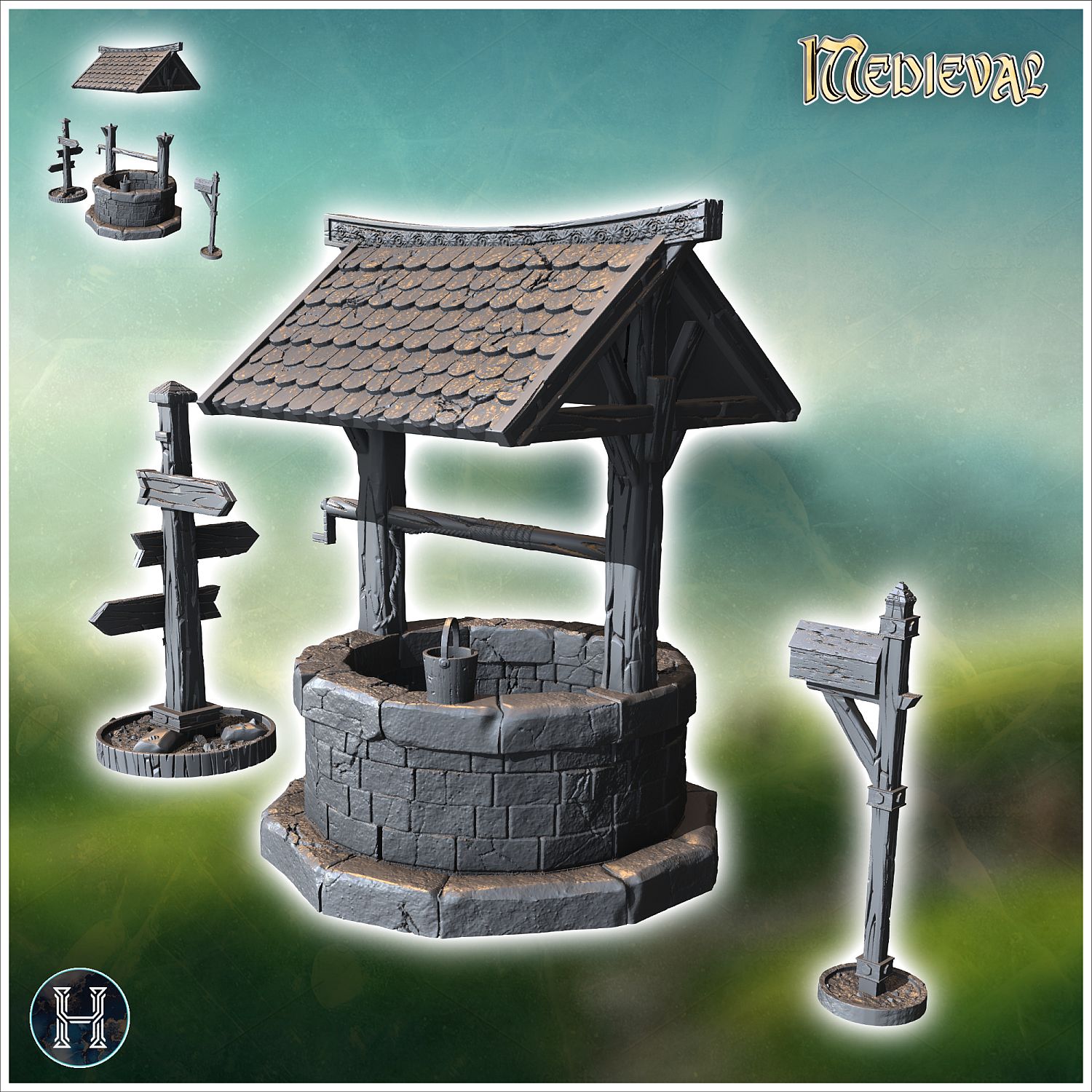 Outdoor Accessory Set With Tile-Roofed Well, Wooden Sign And Letterbox (4) - Medieval Gothic Feudal Old Archaic Saga 28mm 15mm Rpg