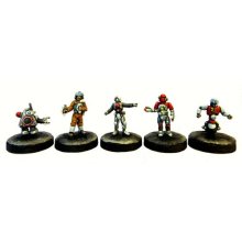The sixth pack of 15mm characters in the Ion Age Universe range. Droids do the dirty work that people don't want and even though they no longer have sentience since the Gurtan Activation they do have dense limited programming making them suitable for repetitive and dangerous jobs. Personal and location security are such tasks and this often puts these droids in harms way. Sculpted by Dave Foley this pack contains five different 15mm scale white metal miniatures.