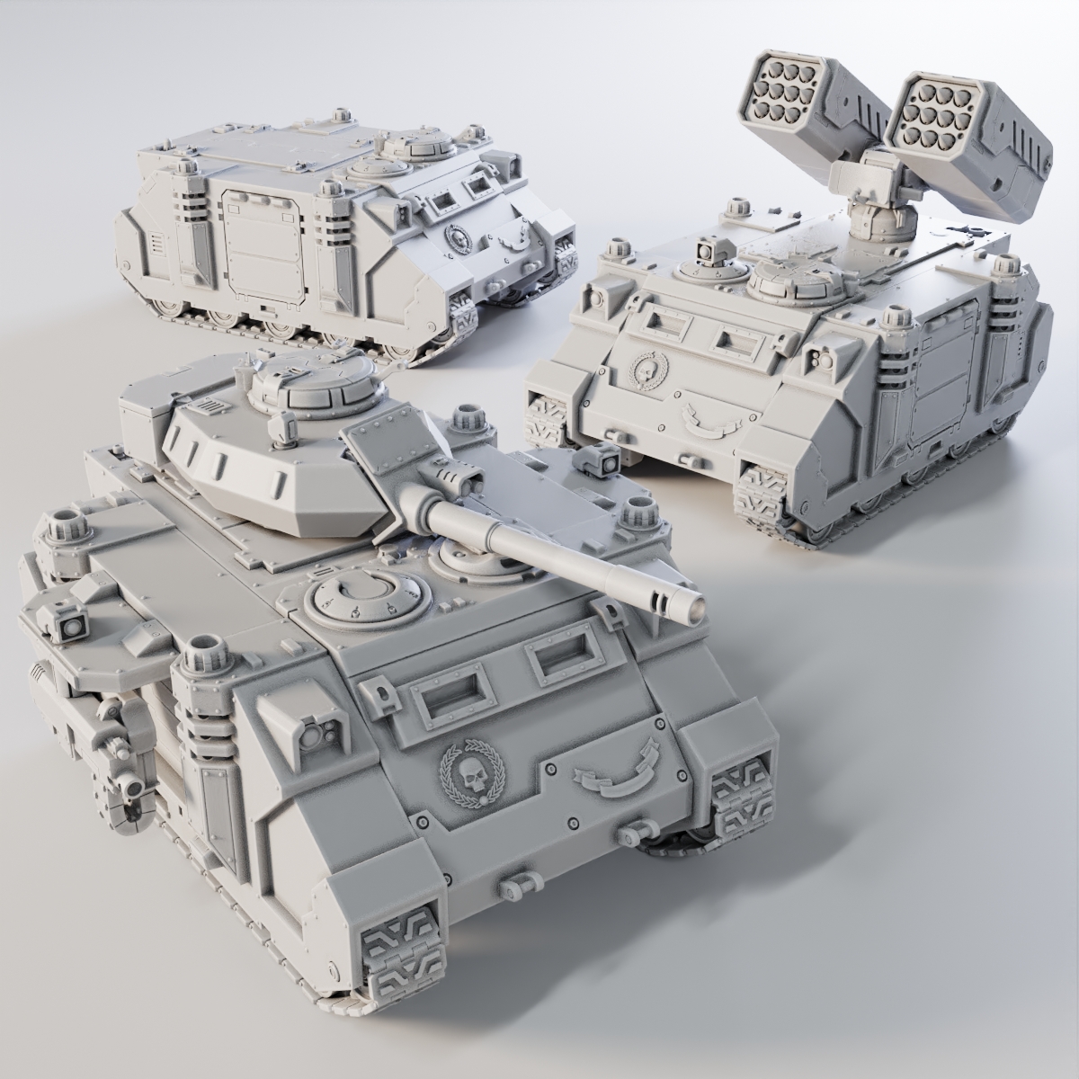Highly detailed proxies for the 40k Predator, Whirlwind and Rhino.
