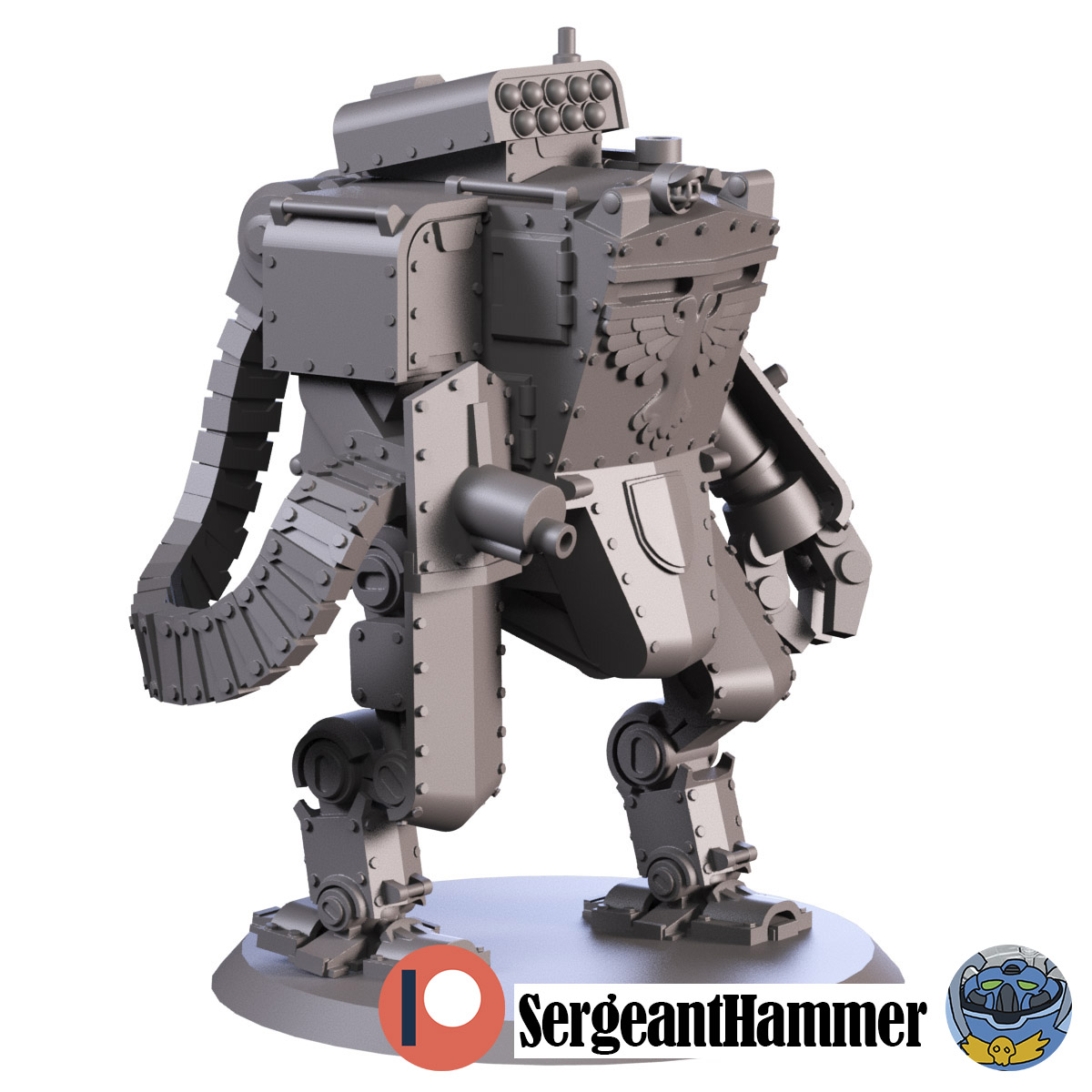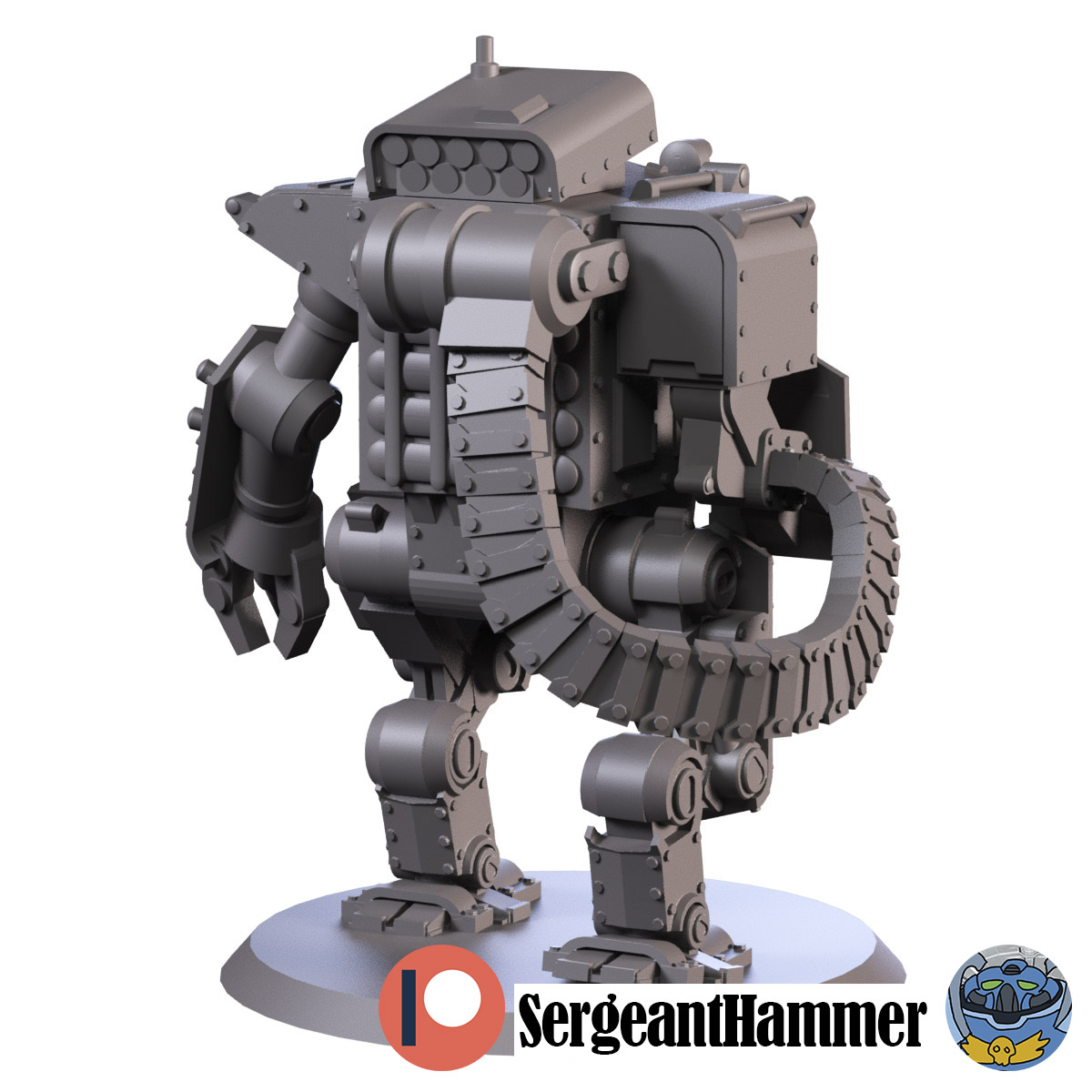 Heavy mecha in 28mm scale - 55 mm height. Mecha armed with a heavy machine gun and anti air missiles. Presupported and no supports multypart version.