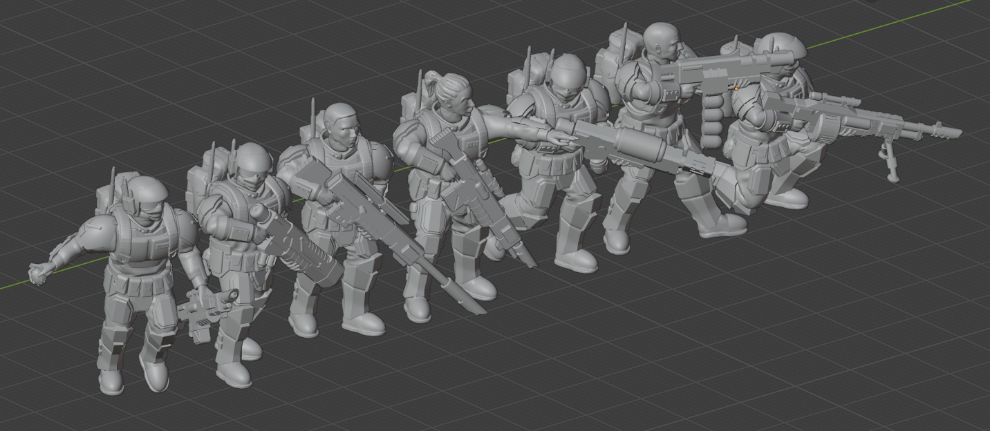. Sniper, Heavy machine gun, Plasma rifle, Melta rifle, Grenade launcher, each with 2 different arm positions