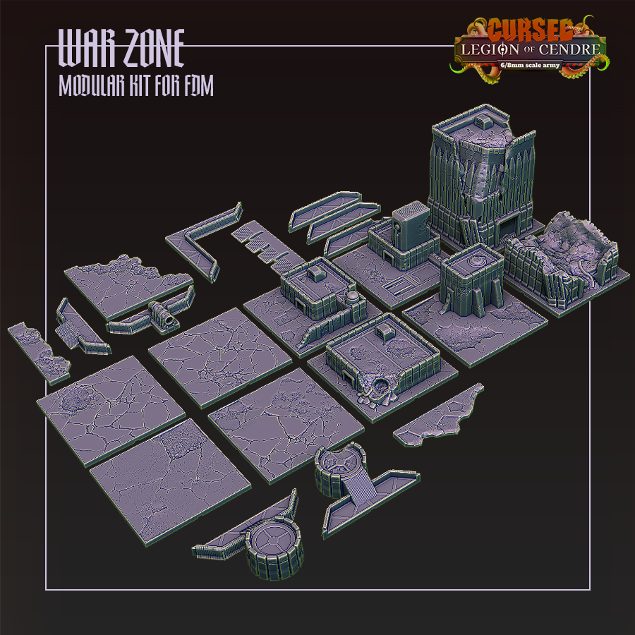 Here's the scenery kit for Cursed Legion of Cendre. Designed for FDM printing, the modular kit will enable you to cover a wide range of play areas. Made for fast printing and fast painting. The terrain is very detailed.
