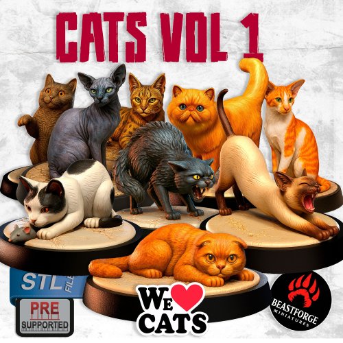 CATS VOL 1 is a collection of 3D printable cat miniatures in STL format, offered in 32mm for tabletop gamers and 75mm for painters and collectors. Each model captures iconic breeds and expressive poses, making this set perfect for role-players, hobbyists, and animal lovers alike