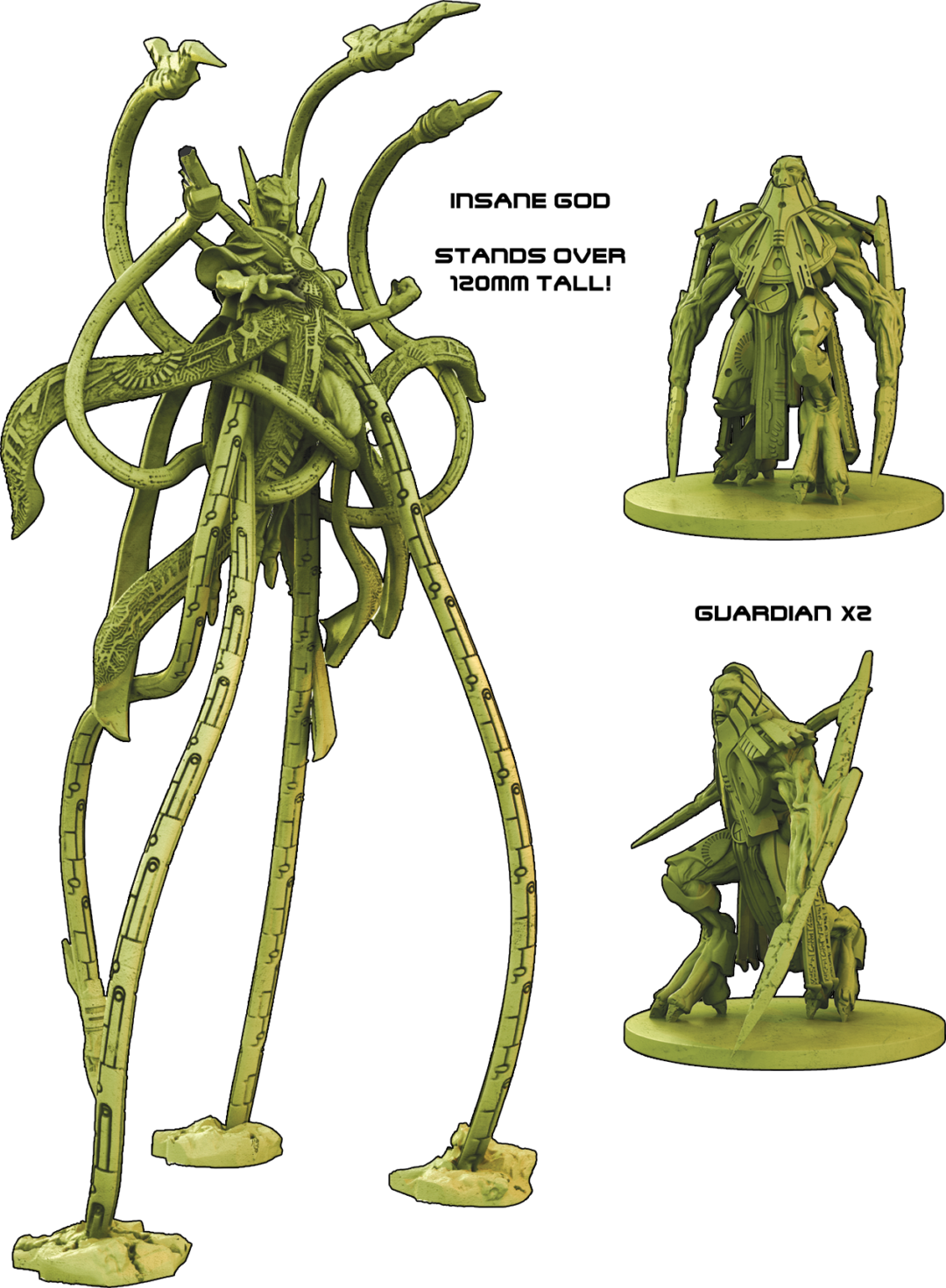 Dissatisfied with the gods of old, a fanatical faction of the First Born created their own, extremely powerful and near indestructible… This expansion adds one of these Insane Gods, standing over 120mm tall, and flanked by its two hulking Guardians!