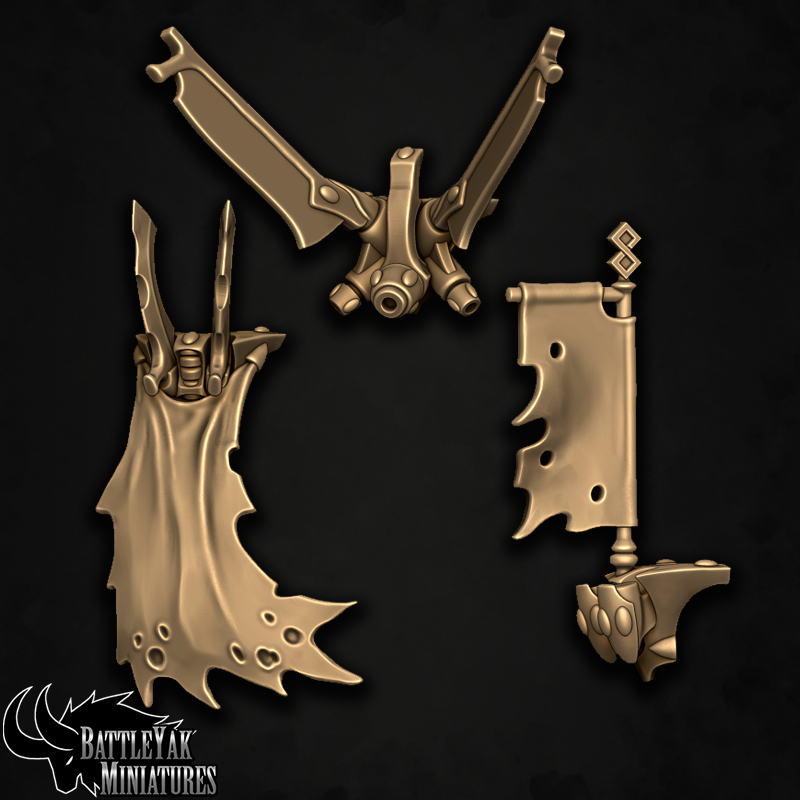 -A selection of customization options, including pauldrons, power-packs, and tabards
