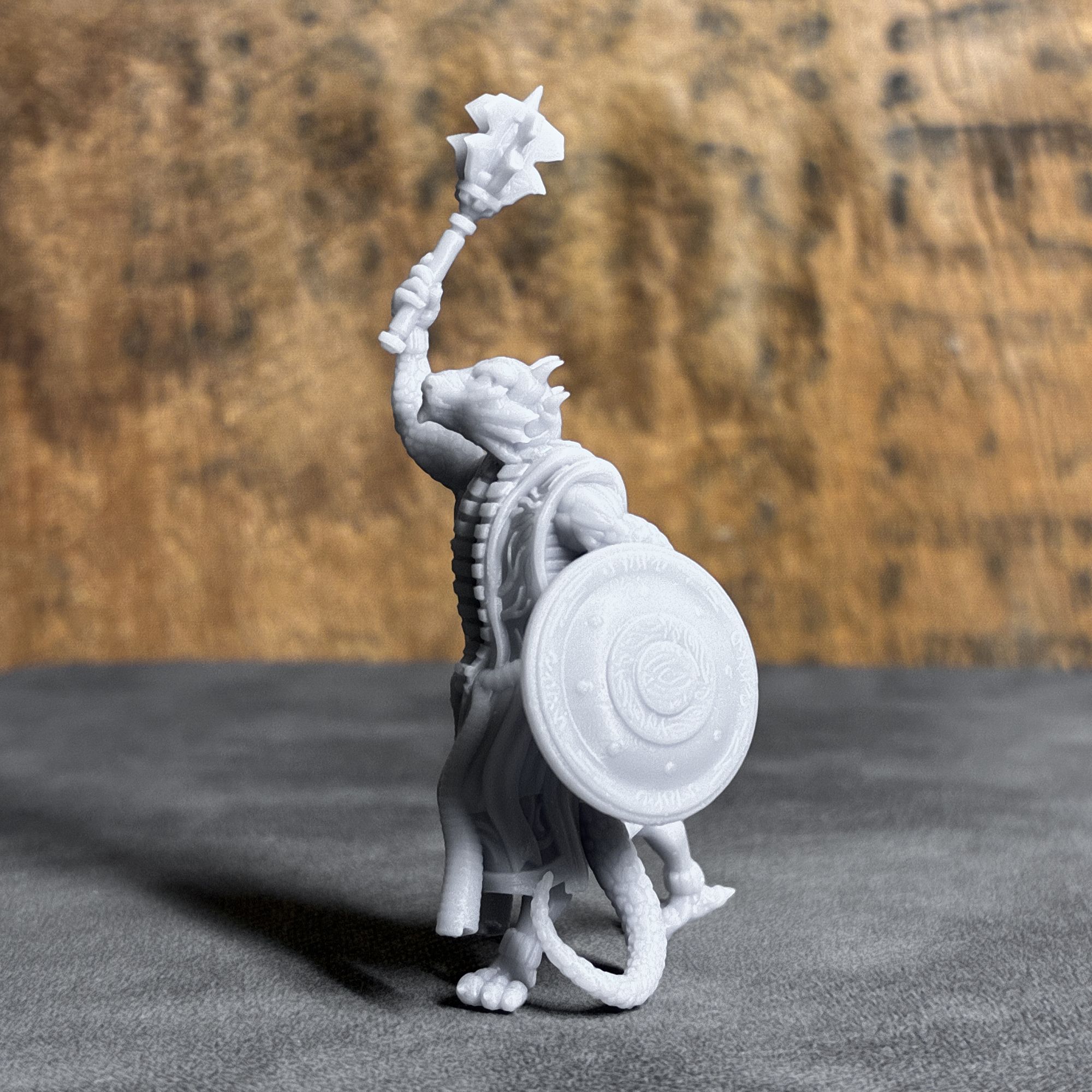 Equal parts reverent and terrifying, this Dragonborn Cleric channels divine might through scale and steel alike. One hand grips a heavy flanged mace, raised high to call down radiant fury - or to rally companions beneath its banner. The other braces a broad shield, ready for whatever answer the heavens give.