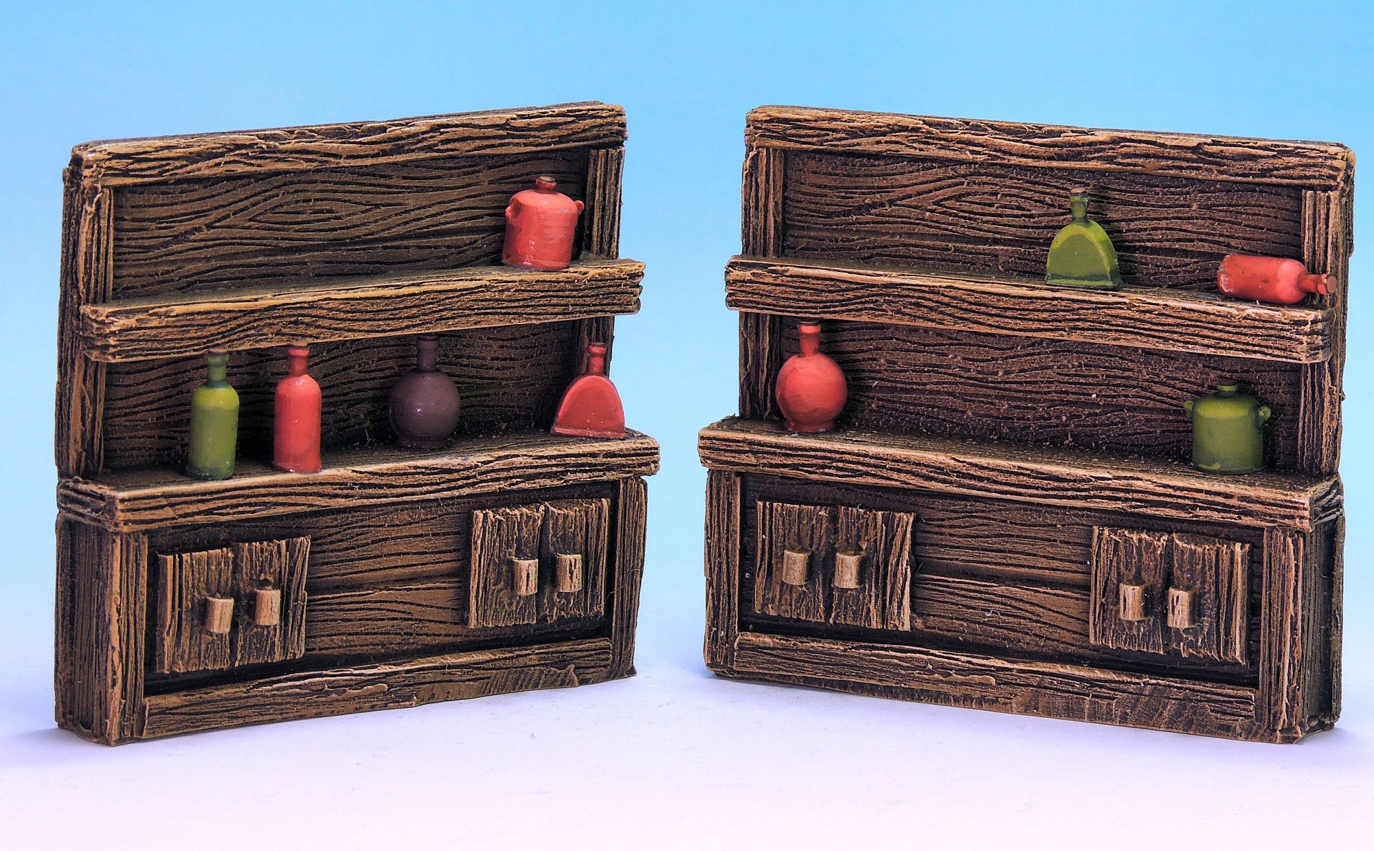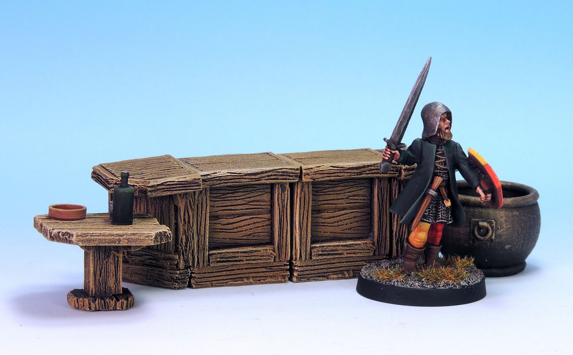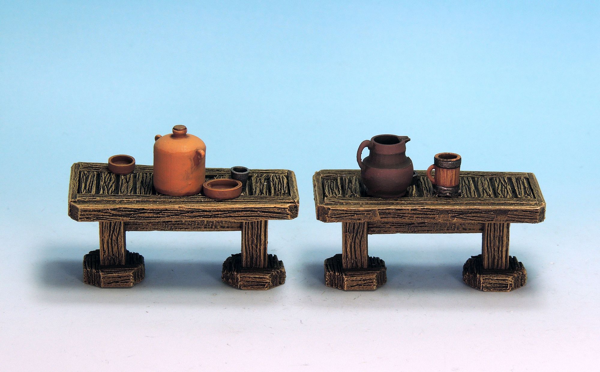 The Tavern Terrain set contains over fifty pieces: two bar shelves; two short, two large and two corner bar counters; two large tables; two small tables; two benches; six stools; one cauldron; three jugs; four sprues of pots, plates, bottles, mugs and glasses.