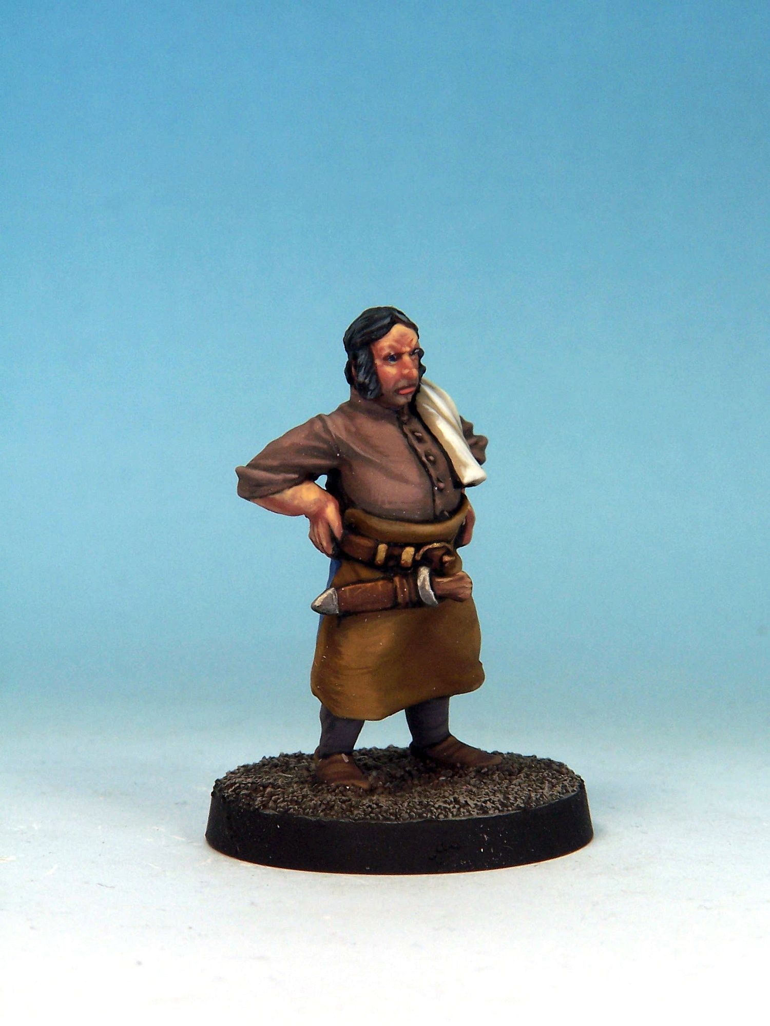 This figure represents the barman, a hardworking member of staff of a fantasy tavern. He wears a well-worn apron, a washrag over his shoulder and a knife at his belt... in case things get rowdy! The figure is a single-piece casting which requires no assembly.