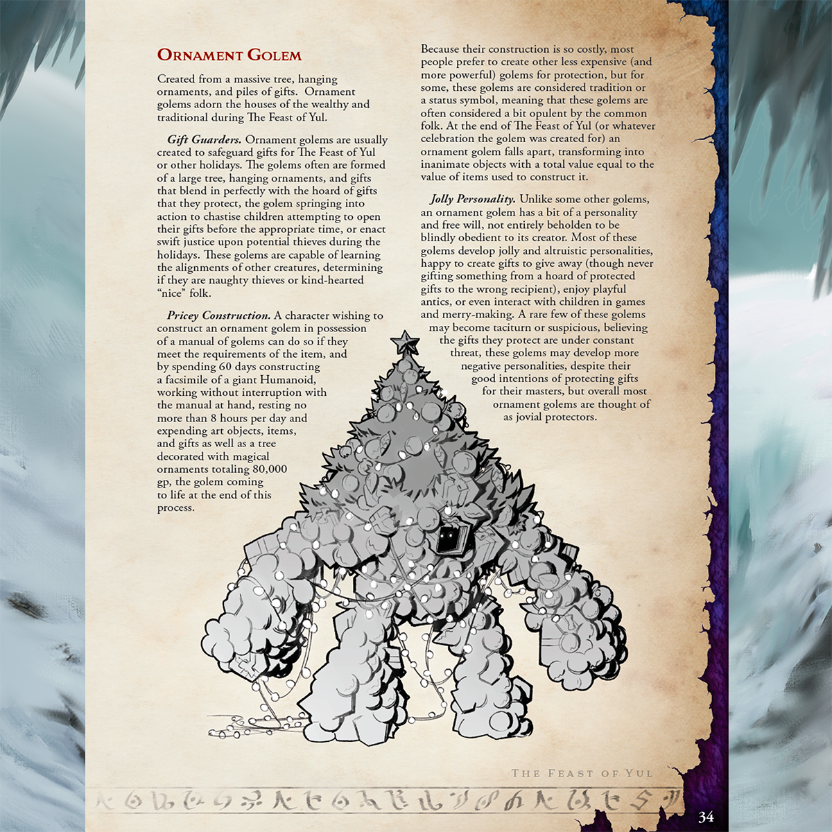 - 5 Stat Blocks - The ornament golem, Yul god of gifts, Yule cat, Frau Prectha the winter hag, and the wooly jotunn troll