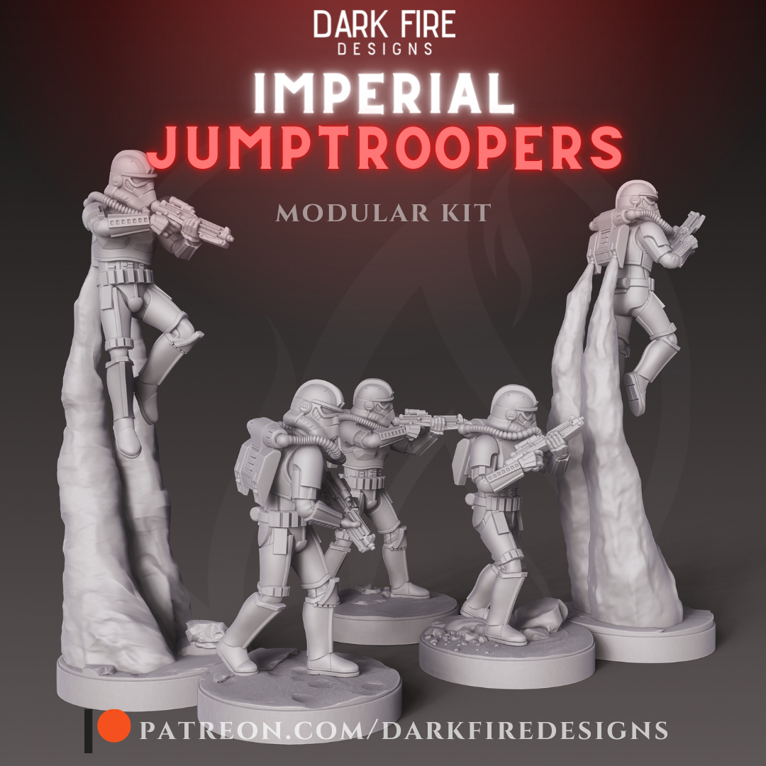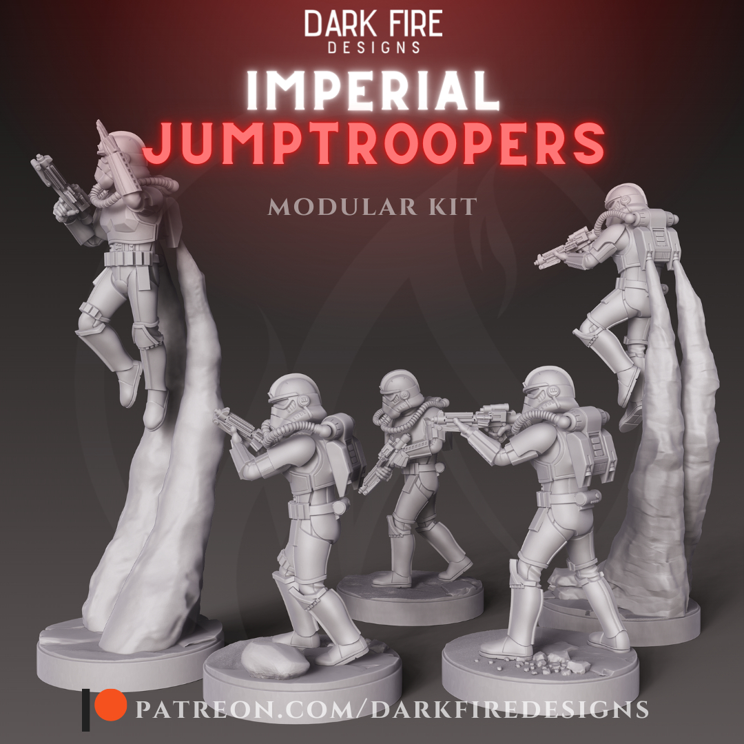 This kit gives you enough parts to make a modular Imperial Jump Trooper Squad. This kit is designed for resin 3d printers.
