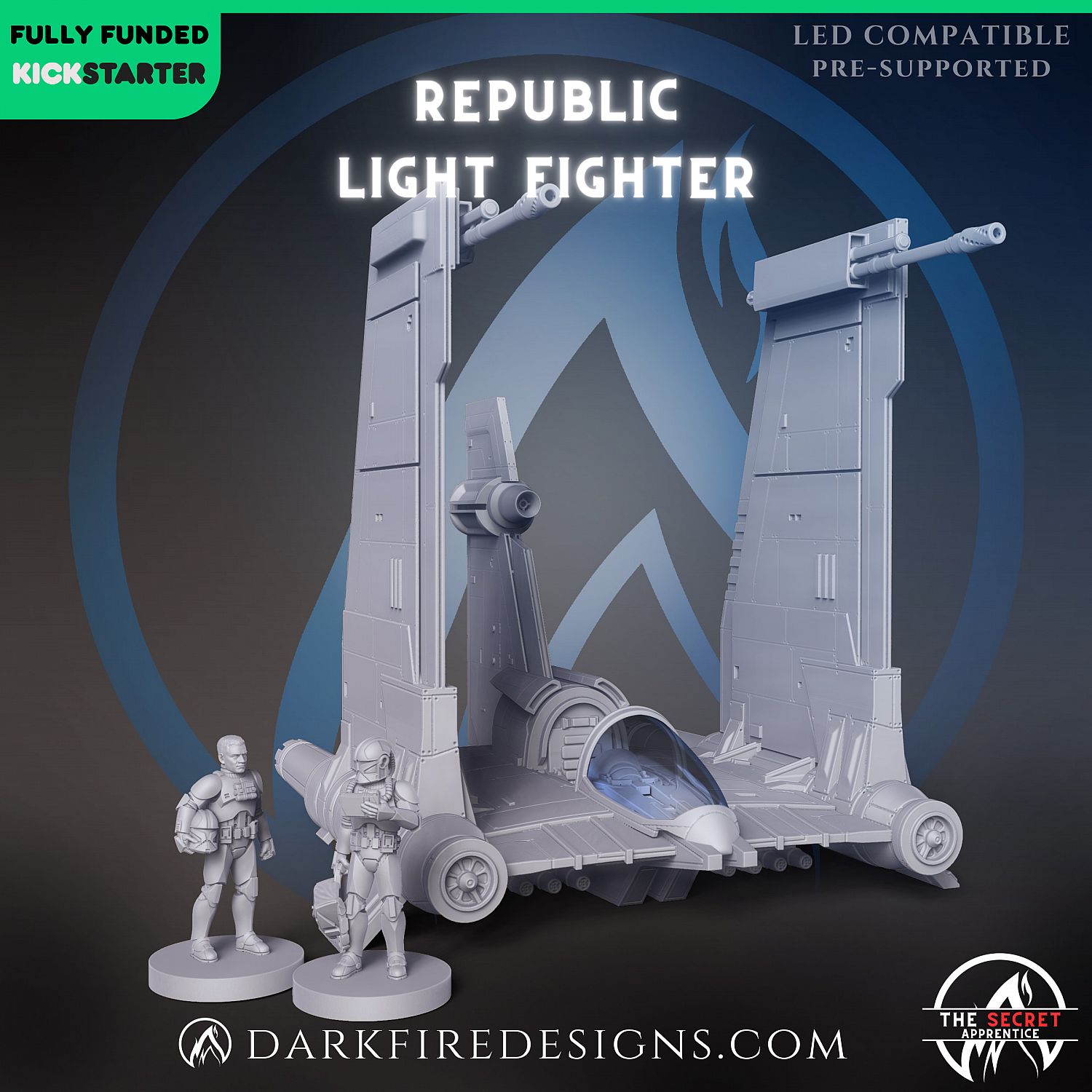 Our comprehensive bundle pack is precisely what you need to ignite the flames of the epic war between the Republic and Separatists right on your tabletop. This package equips you with the STL files for the robust Republic Light Fighter in its pristine glory and the tragic splendor of its crash-site version, truly capturing the tumultuous spirit of these great conflicts.
