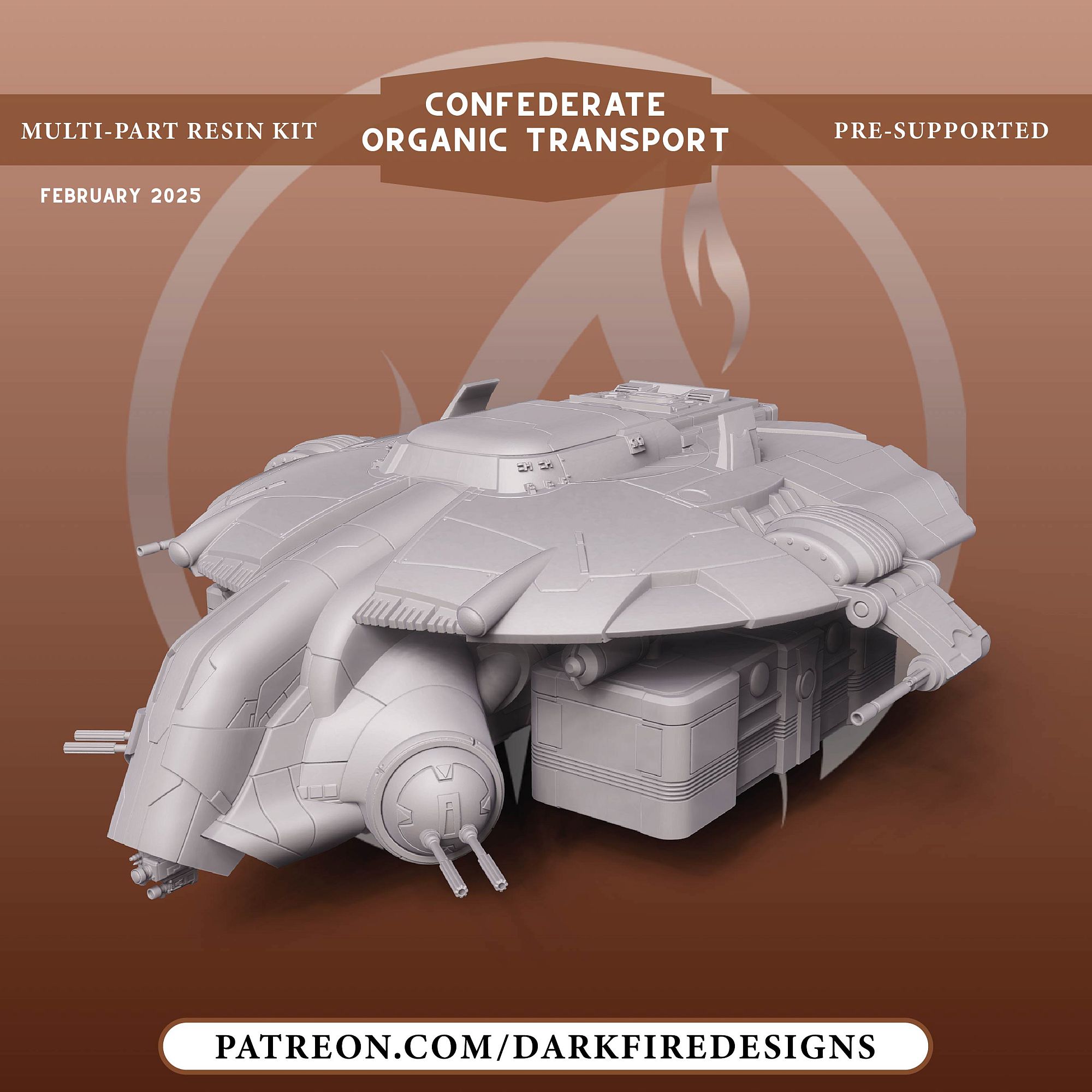 Featuring options for either whole main body printing or subassemblies, this model can be printed by small or large printers alike. Included is a troop bay and seated Conscripts.