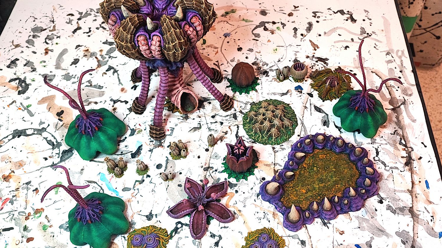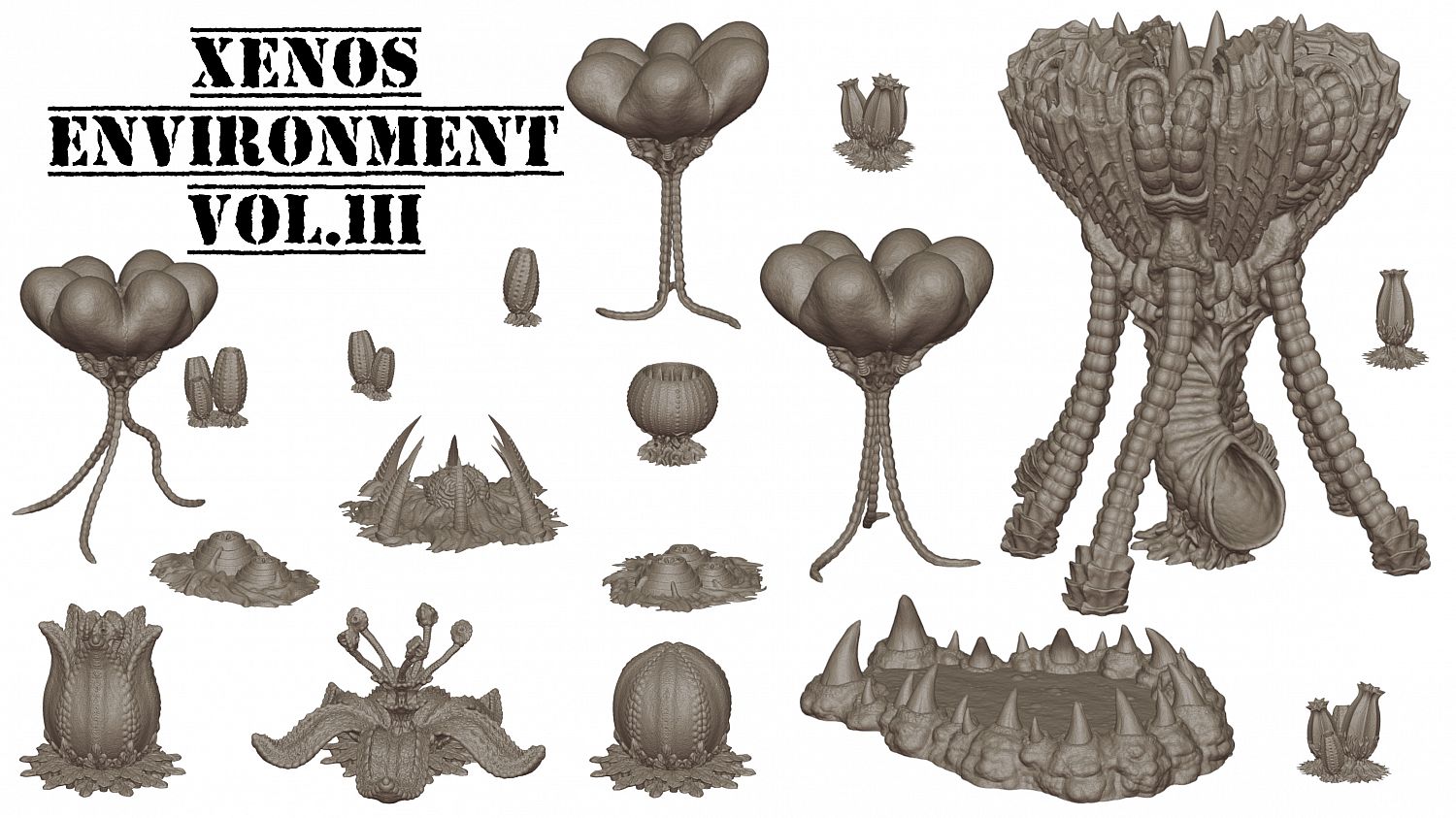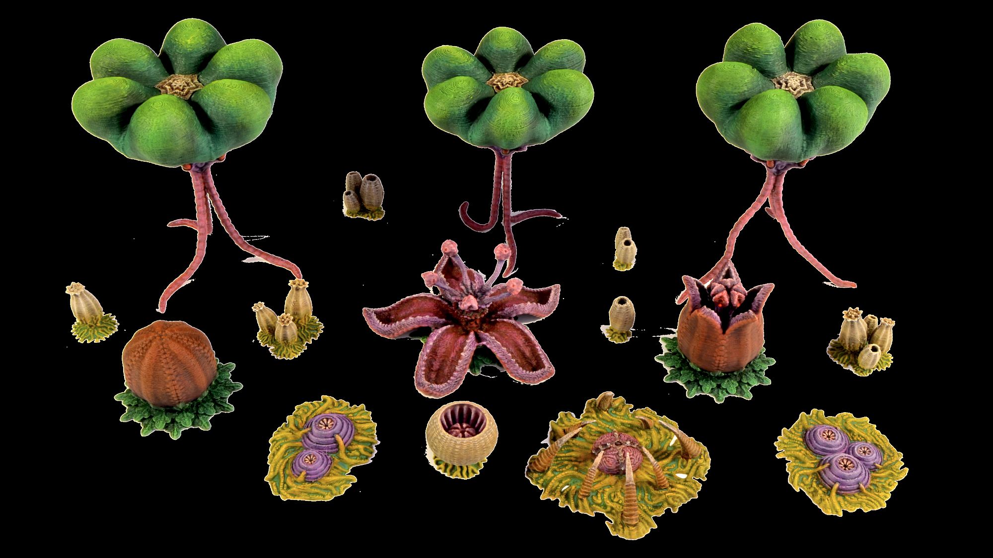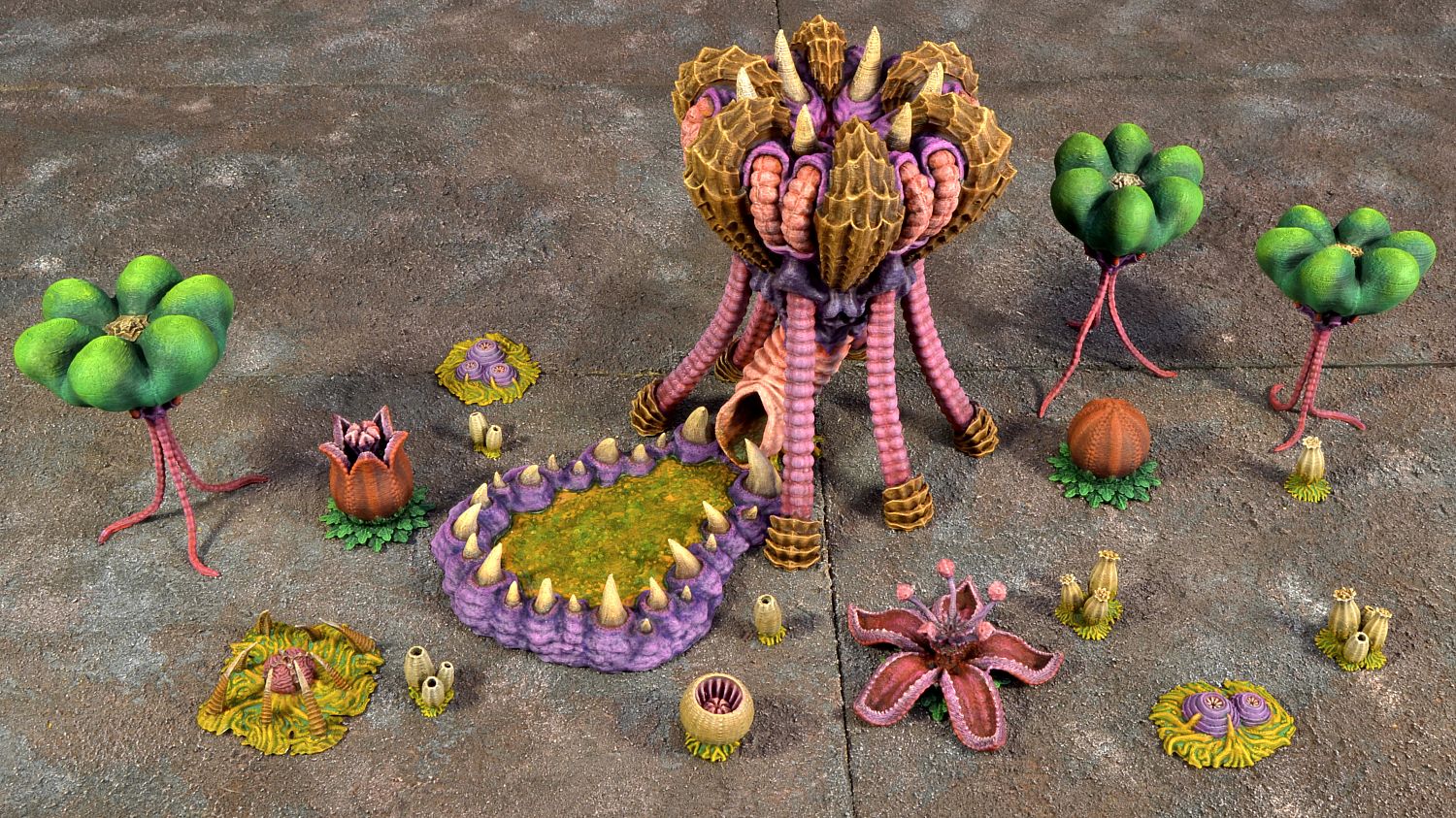 A set of pieces so that, once printed, you have elements of scenery of the biological-alien type with which to set your role-playing games, tabletop games, wargames, dioramas... Created for 28mm scale tabletop games (of course that you can rescale them as much as you want, although some especially small pieces can look bad if they are reduced too much), which will serve you to set the scene for distant planets, usually colonized by dangerous and hungry xenomorphs...