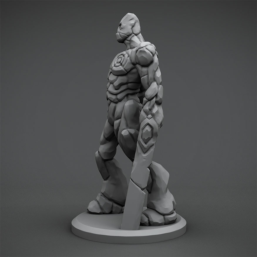 So this here is a stone golem. A magical construct of the stone variety. This particular guy has one fist, and one blade arm that he has buried partially into the ground for some reason (it's to make it print with less supports).