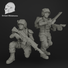 This kit includes a sniper and spotter team. The sniper comes as two single piece options, each with a different rifle. The spotter comes with a separate head and is compatible with other heads in the Imperial Contractors range as well as heads from other creators such as Anvil and The Maker's Cult.