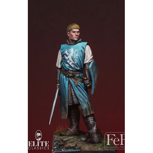Our Norman Knight could be a descendant of the early Norman crusaders that went to Holy Land during the First Crusade and his garment is typical from mid XIII century, based primarily on chainmail (omnipresent on the battlefield since several hundred years). Heraldry was not yet as elaborated as it would be later, but was already in use in surcoats and shields. This miniature offers countless options for decoration for any painter.