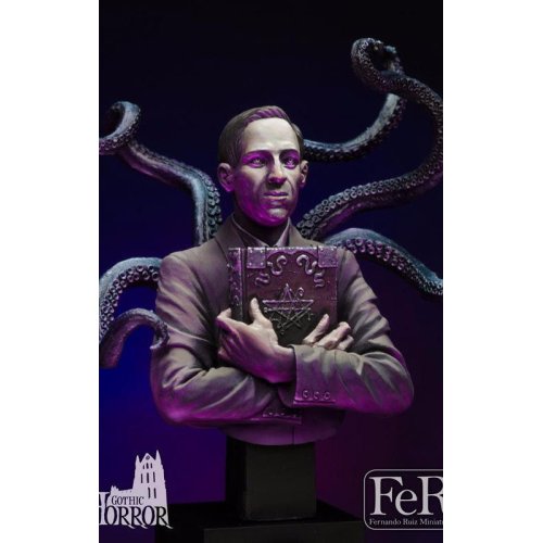For our bust we have decided to portray him holding the one of the most famous fictional books ever, the ominous Necronomicon, full of horrible truths and forbidden arcane knowledge, capable of driving insane anyone who reads it. Lurking behind the writer, the tentacles of some obscene and impossible creature that might have waited uncountable aeons before making its presence noticed through some ancient and blaspheme ritual.