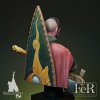 Our bust depicts Duke William, equipped with some typical gear elements of the Norman warriors, like the conical helmet with nose guard and a kite shield.