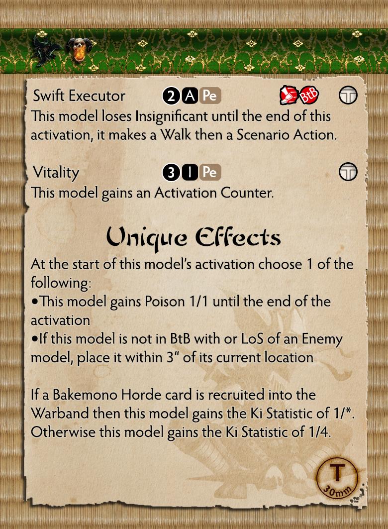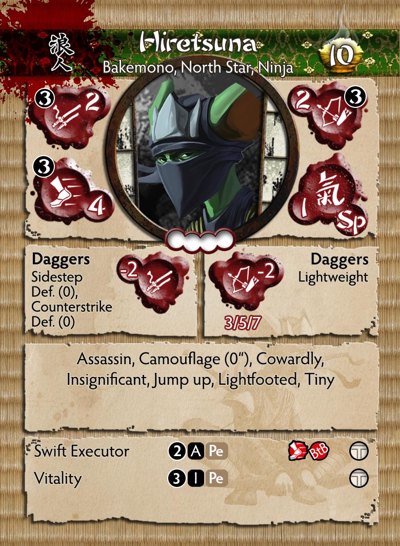 Hiretsuna is an oddity amongst the Bakemono, selected by the Council of Shadows at a young age and marked for greatness. The Council have invested heavily in Hiretsuna and when the Kage Kaze Zoku agreed to train him their plans moved one step forward. His race’s natural affinity for subterfuge combined with his practised skills make him also impossible to stop, he is able to strike with pinpoint accuracy where his opponent can least afford.