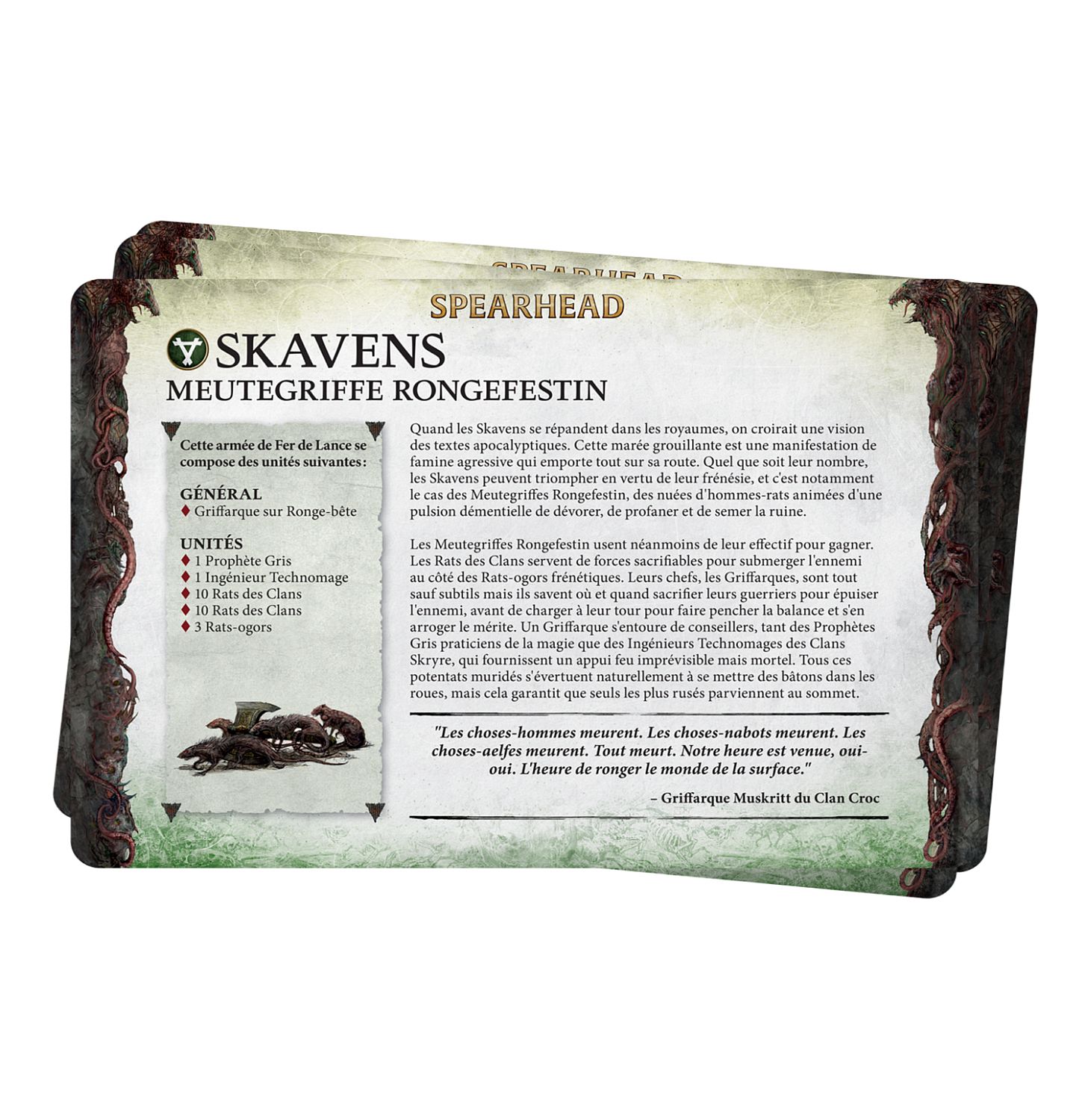 Pendant des siècles, les perfides Skavens se sont échinés sous terre comme une infection sous la peau et ne sortaient que pour attaquer leurs ennemis aux côtés des monstres et de machines hideuses. Désormais, ils surgissent dans tous les royaumes dans une explosion de corruption, leurs siècles de machinations portant leurs fruits.