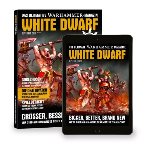 Der White Dwarf ist das ultimative Warhammer-Magazin. Jede der monatlich erscheinenden Ausgaben ist ein 156-seitiges Hochglanzmagazin im A4-Format mit all den Neuigkeiten, Artikeln und Bildern, die du kennst und liebst – und eine ganze Menge neuer Dinge, die du dir nie hast vorstellen können. Neuigkeiten! Golden Demon! Spielberichte! Meisterklasse-Malworkshops! Anmerkungen der Designer! Exklusive Regeln! Und natürlich wunderschöne Fotos der besten Fantasy-Miniaturen der Welt.