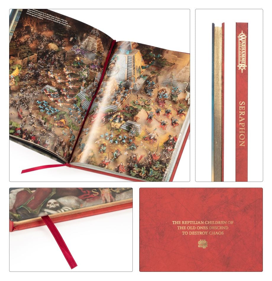 This limited edition of Battletome: Seraphon is a relic befitting the temples of the Old Ones, featuring a red ribbon marker, gold gilt page edges, gold foil blocking, and soft touch lamination. It's strictly limited to 500 individually-numbered copies, only available while stocks last.