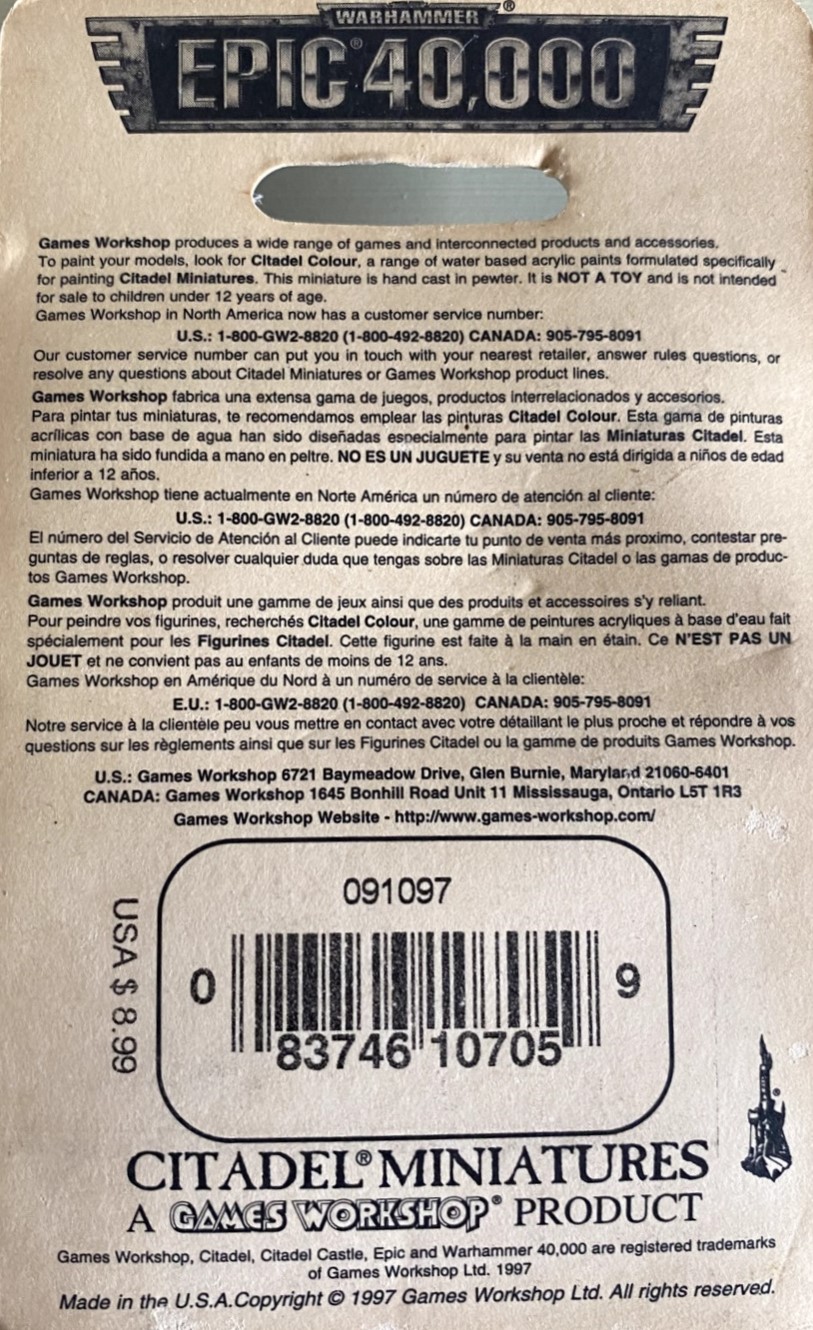 Тип: Miniature Материал: White Metal Released: 1 March 1997 Discontinued: ? Миниатюр в наборе: 3 Масштаб: 6mmScale Calculator Известная цена: $8.99 Упаковка: Blister Как создано: Physical, by hands id: gw-8705a- Short Url:/s/1ZPpWoW!