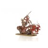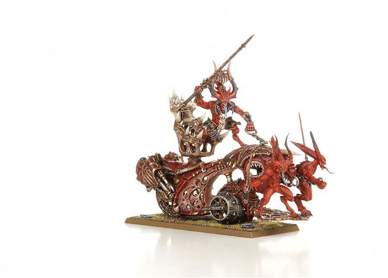 The Blood Throne of Khorne is an industrious creation, a hybrid of flesh and daemon engine, and comes bedecked in icons of Khorne. The body is based around a large, curved, frame, which from one angle looks like a huge open mouth rolling forwards upon barbed, cylindrical wheels; yet from others is very much a machine. There are metal tubes, wires and pistons as well as horns, skulls, spikes and open maw motifs. At the front is a platform based on the Khorne symbol, and standing on it are two horned Bloodletters holding chain. But at the top of the Bloodthrone variant is a mighty skull and horn-wreathed throne. Standing atop that is an armoured and muscular Herald.