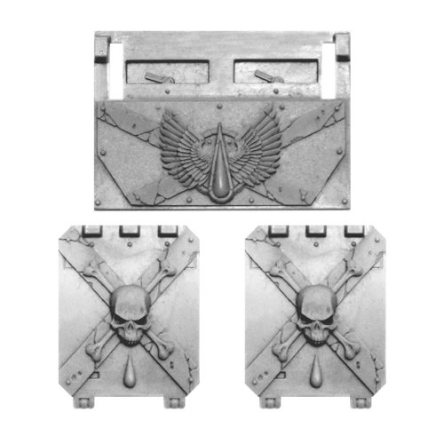 2 finely detailed replacement resin doors and 1 replacement resin front plate for the plastic MkII Rhino kit depicting Death Company iconography.