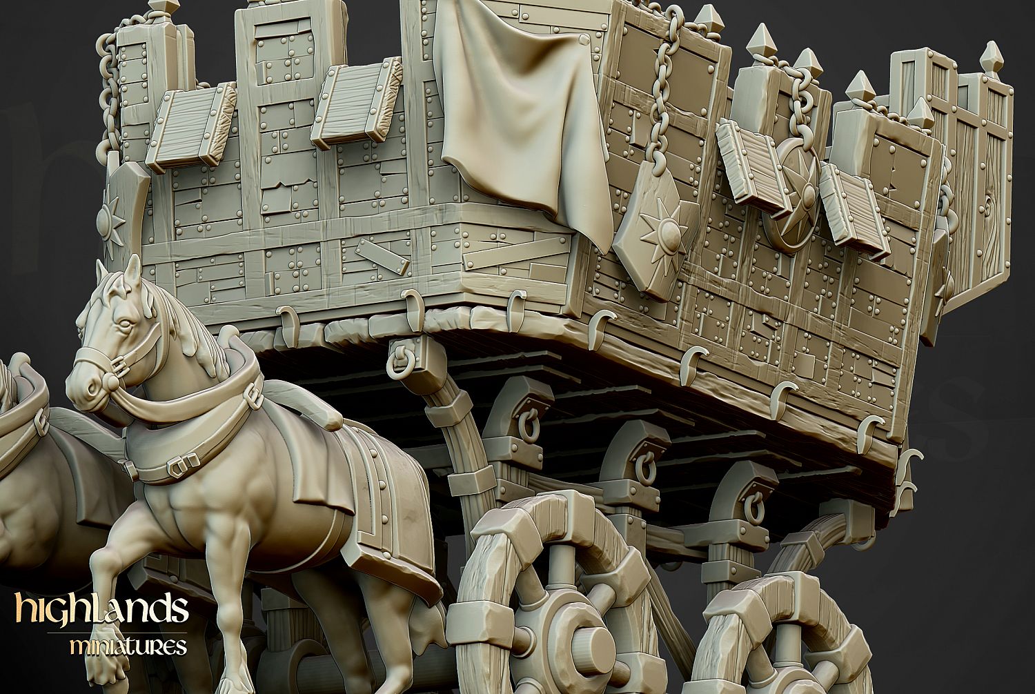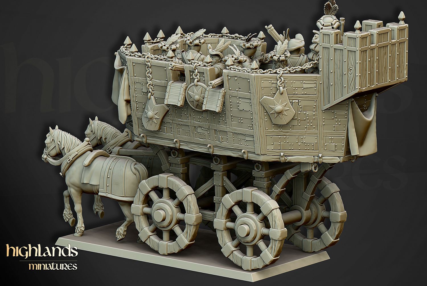 Here you have the Wittemberg Wagon from Highlands Miniatures August 2021 Release. The Wagon is split in several pieces to be able to be printed with standard resin printers.