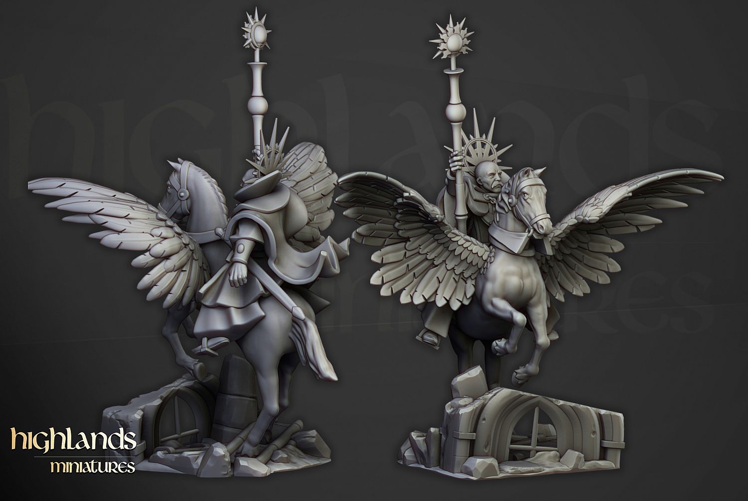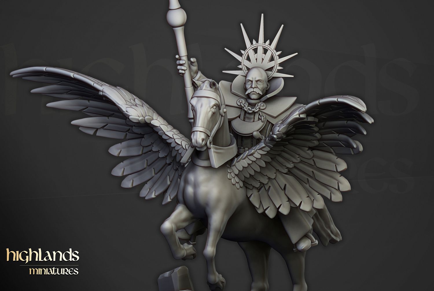 Here you have Merzhin Ambroaz, the High Wizard of Sunland: one (1) high mage on Pegasus, from the April 2022 Release of Highlands Miniatures. This product includes: