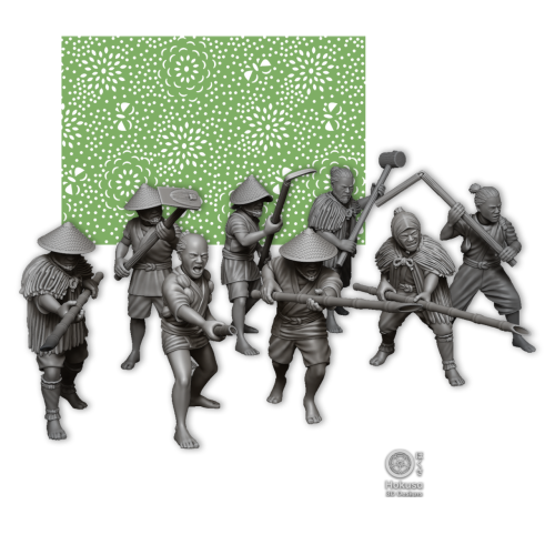 This pack contains Ikko Ikki Villagers Fighting with assorted weapons (Bamboo Yari, Hoe and Wooden Hammer), x8 minis as well as heads and accessories. The Models are made for the 28mm scale, but can be scaled up and down (Might need new supports).