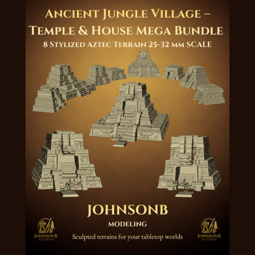 Step into the heart of a forgotten jungle civilization with this "Support Free" Ancient Jungle Village Mega Bundle — a complete modular set of temples, stepped houses, and sacred ruins designed for 28–32 mm tabletop games and fantasy dioramas.