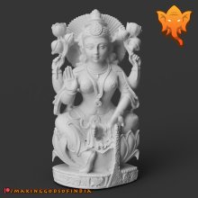 Lakshmi is depicted in Indian art as an elegantly dressed, prosperity-showering golden-coloured woman standing or sitting in padmasana on a lotus throne, while holding a lotus in her hand, symbolizing fortune, self-knowledge, and spiritual liberation.Her iconography shows her with four hands, which represent the four aspects of human life important to Hindu culture: dharma, kāma, artha, and moksha.