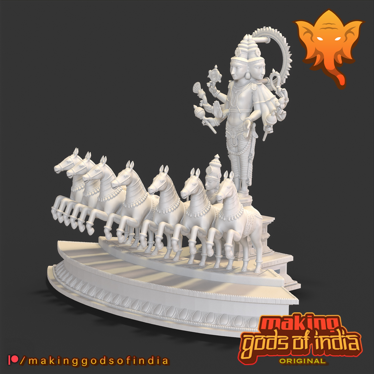 Surya is the sun and the solar deity in Hinduism. The iconography of Surya is often depicted riding a chariot harnessed by horses, often seven in number which represent the seven colours of visible light, and seven days in a week.
