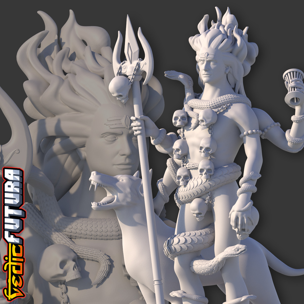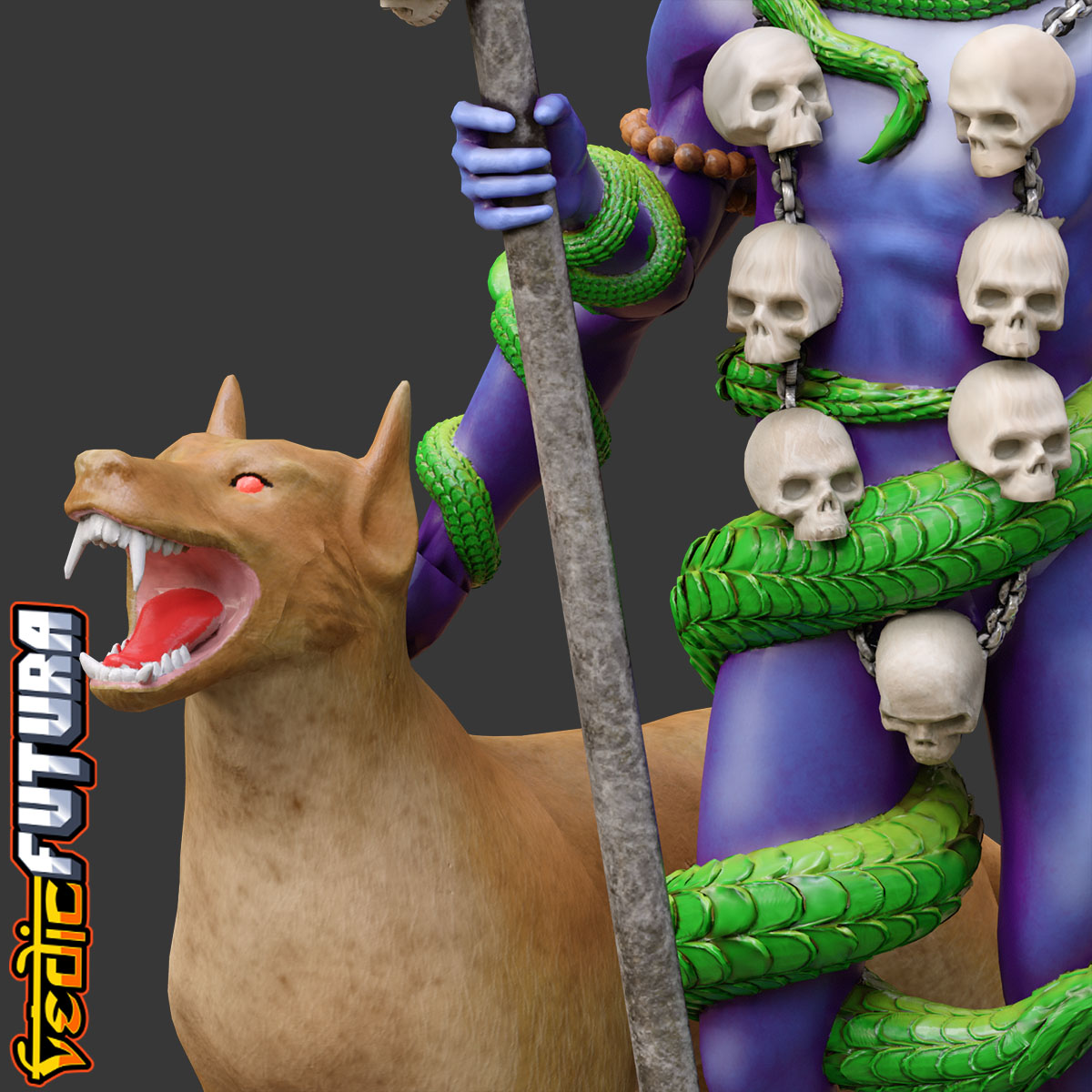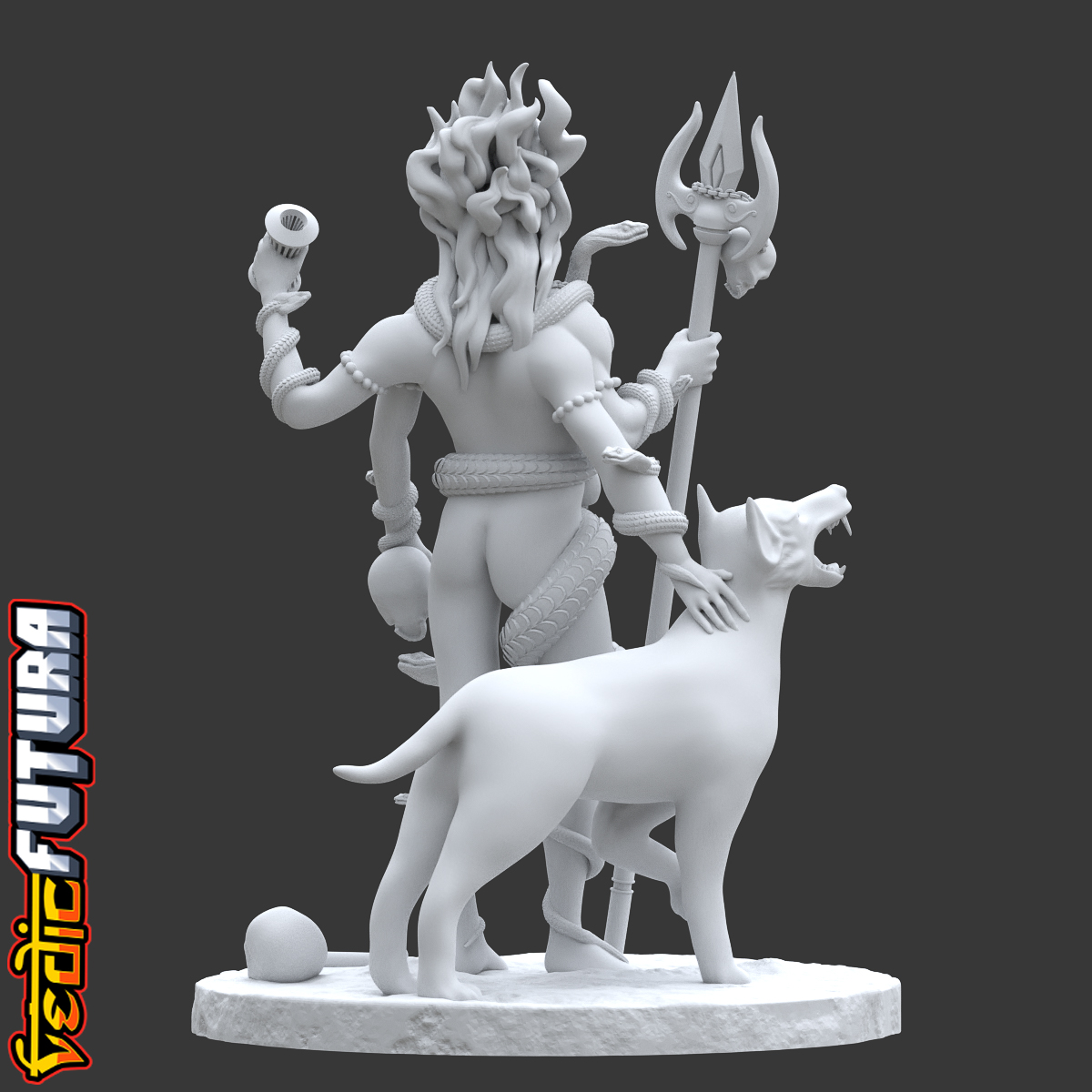 The sculpture of Hindu god Bhairava depicts a powerful and intense deity. Bhairava appears naked, with coiled serpents around his limbs, symbolizing his control over primal forces. He has matted hair and a disheveled appearance, conveying his untamed nature. In one hand, he holds a trident, representing his authority over time, and in the other, he carries a skull as a reminder of mortality. By his side, a loyal dog accompanies him, signifying his role as a guardian of boundaries. In Hindu mythology, Bhairava is an incarnation of Lord Shiva, born to dispel ego and impurities. This sculpture captures Bhairava's fierce and awe-inspiring presence, representing his divine role in guiding and protecting his devotees on their spiritual journeys.