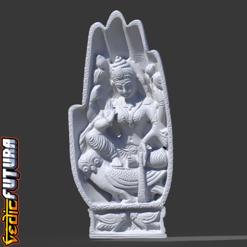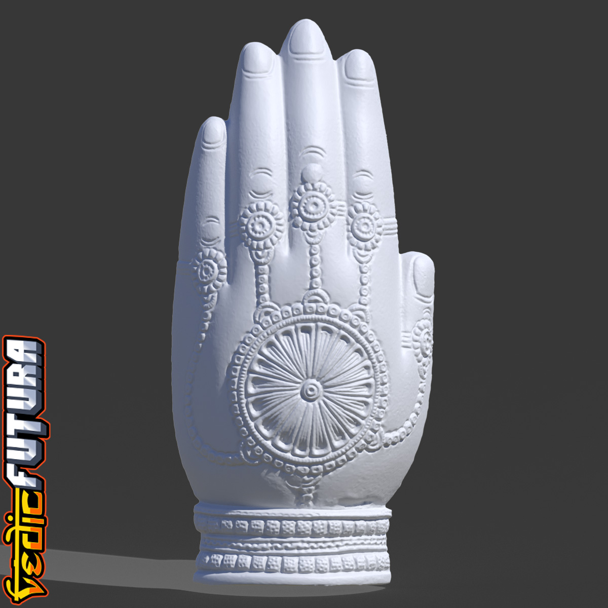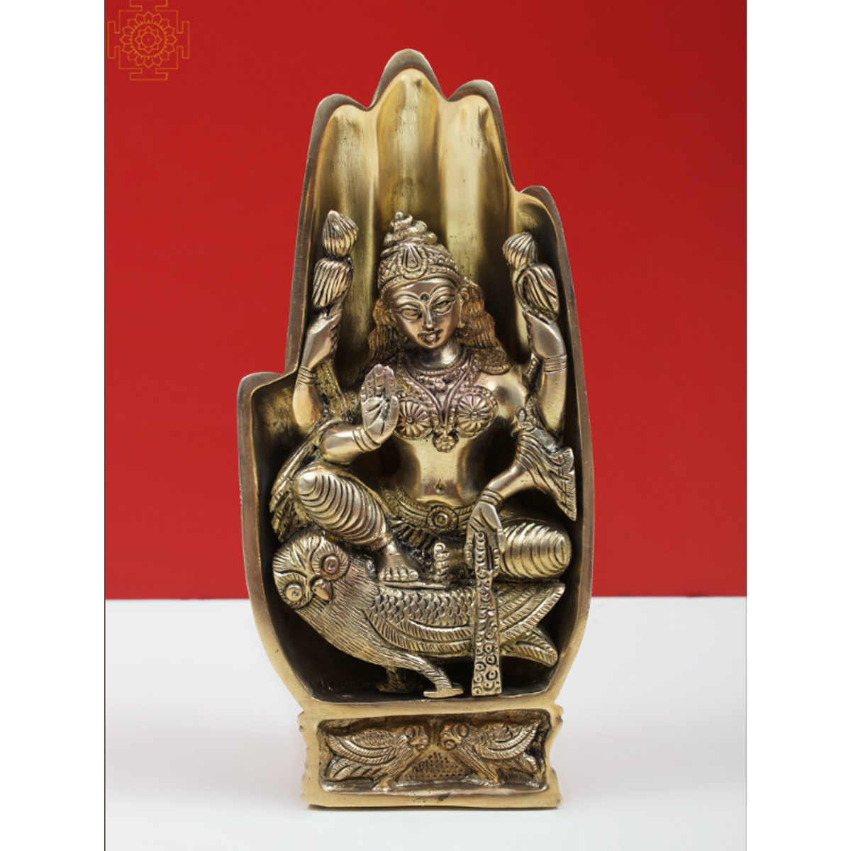 This exquisite sculpture integrates multiple symbols of prosperity and protection, representing Goddess Lakshmi, the Hindu deity of wealth, fortune, and abundance. Molded into the shape of an open palm, which traditionally signifies the Abhaya Mudra, this gesture offers reassurance and dispels fear, underscoring Lakshmi's role as a benefactor who provides blessings and safety to her devotees. The palm also includes the intricate Dharmachakra or "wheel of law," an emblem of divine law and the eternal cycle of life which Lakshmi supports through her nurturing abundance.