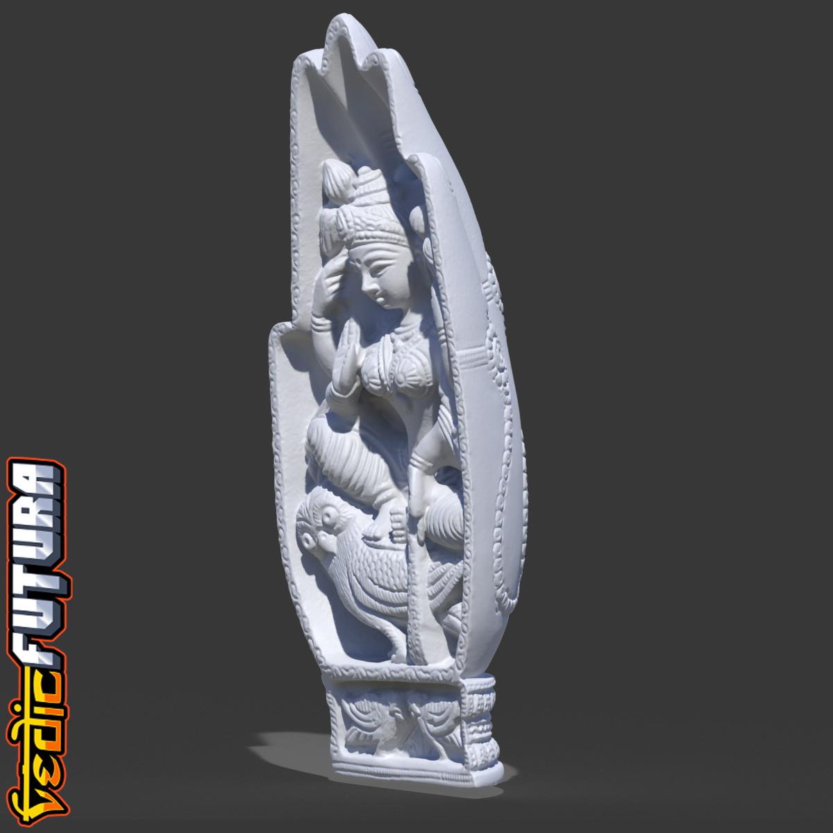 Uniquely, the sculpture features Lakshmi mounted on an owl, a vahana (vehicle) that is less commonly associated with her compared to the elephant. In Hindu mythology, the owl signifies wisdom and vigilant observation, traits that complement the discerning aspect of wealth management. The owl's ability to navigate in the darkness also metaphorically aligns with Lakshmi's guidance in helping devotees find their way through the trials and tribulations of life.