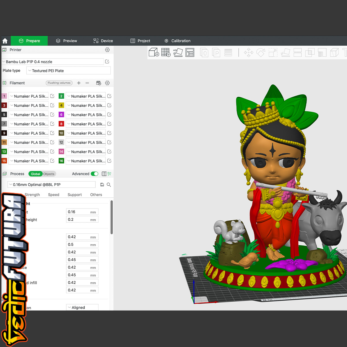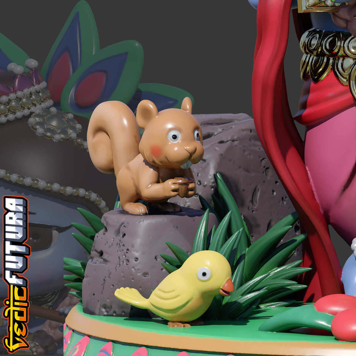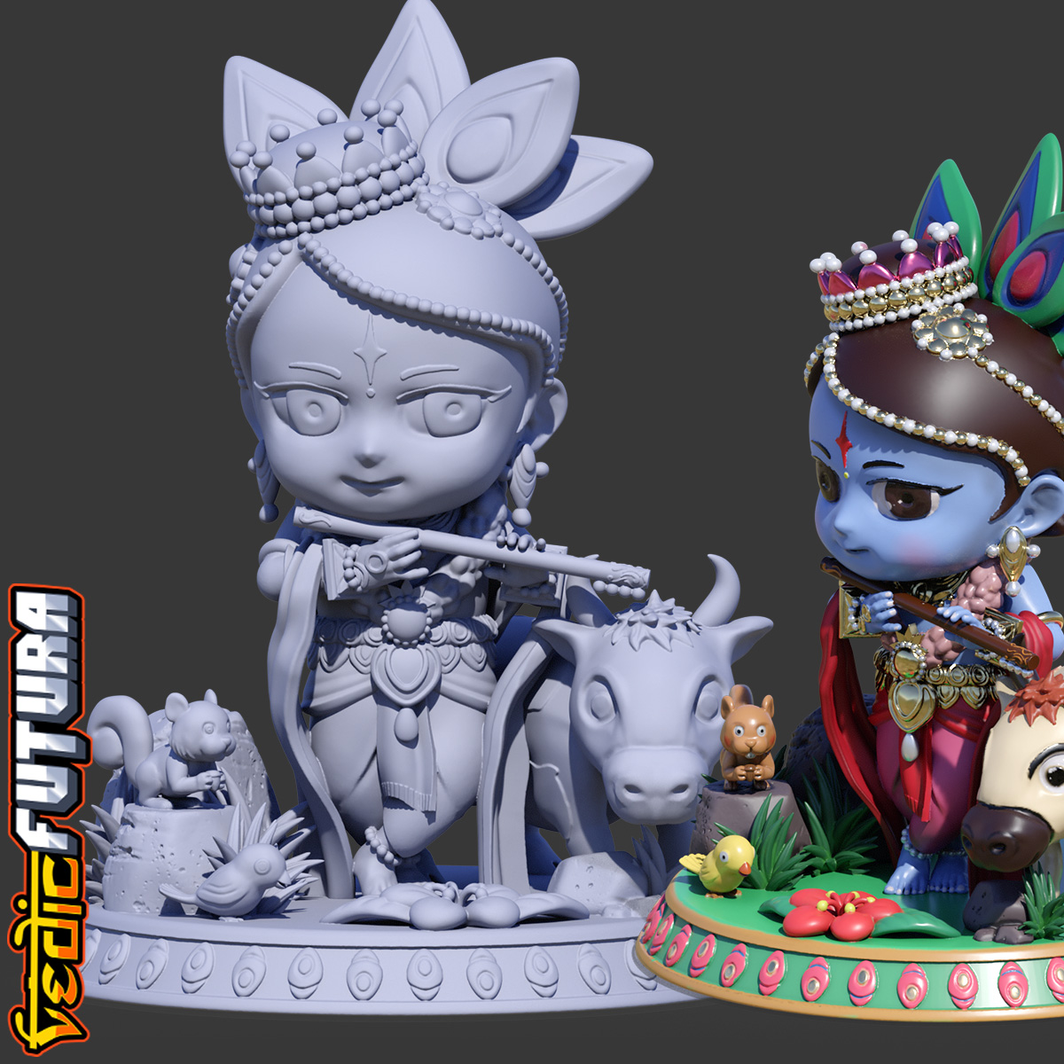 This is Gopala Krishna in the chibi style, standing in his classic flute-playing pose. He wears a peacock feather crown, pearl jewelry, and ornate garments. A gentle cow stands by his side, while a squirrel, bird, and floral elements decorate the base, evoking the pastoral charm of Vrindavan.
