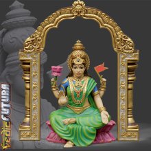 Seated on a pink lotus and clothed in vibrant green garments, Dhanya Lakshmi is shown with eight hands. She holds a mace, lotuses, and a variety of crops such as sugarcane and paddy, while two hands are posed in Abhaya and Varada mudras. Her form is a reminder that all sustenance springs from divine grace, and that gratitude and sharing are essential aspects of abundance.