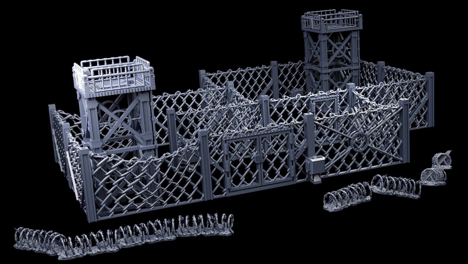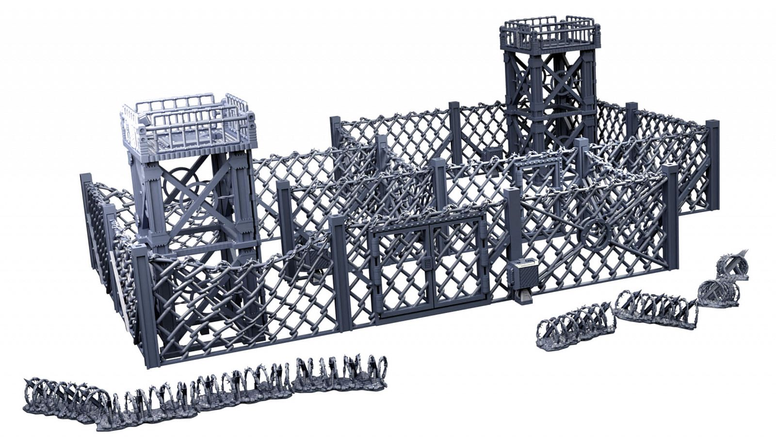 Selection of chain link fence panels, including door segments, fences with signs and bent/broken fences. Comes with Lychee project files for resin pre-supported prints.