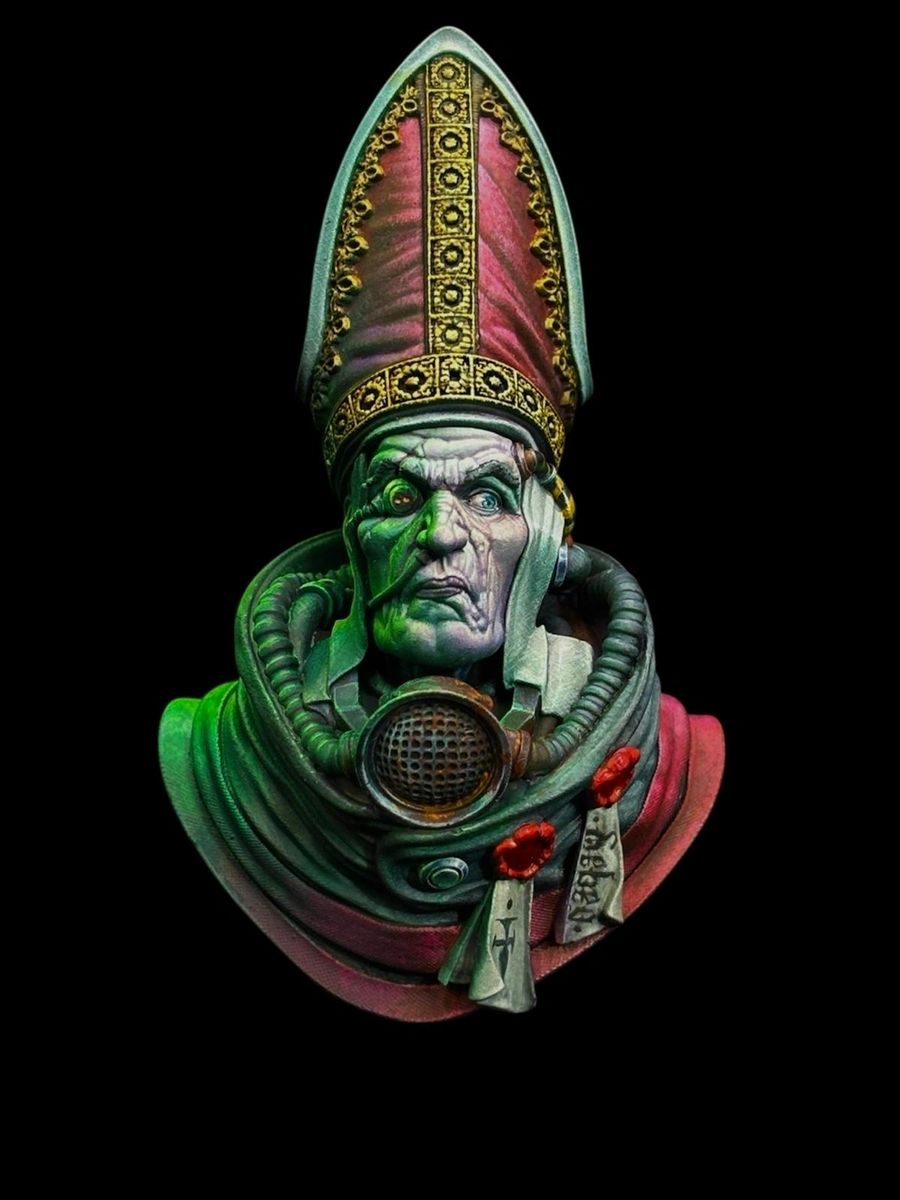 Born from a three-headed project: @depaoli.alessandro , the hand that sculpted it, the one who created this amazing BoxArt @aurelianpaintingstudio and our. The bishop will be the first of a triptych of busts, set in this dystopian world.