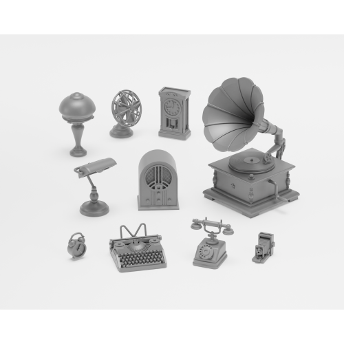 In this pack, you'll find all the common electronic equipment of a WWII European household, suitable for dioramas from the 1930s to 1945.