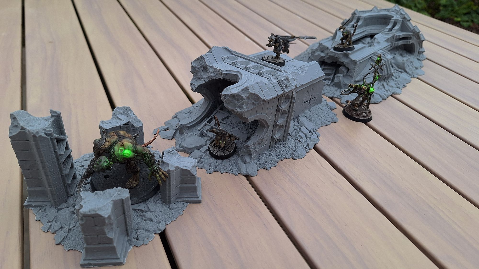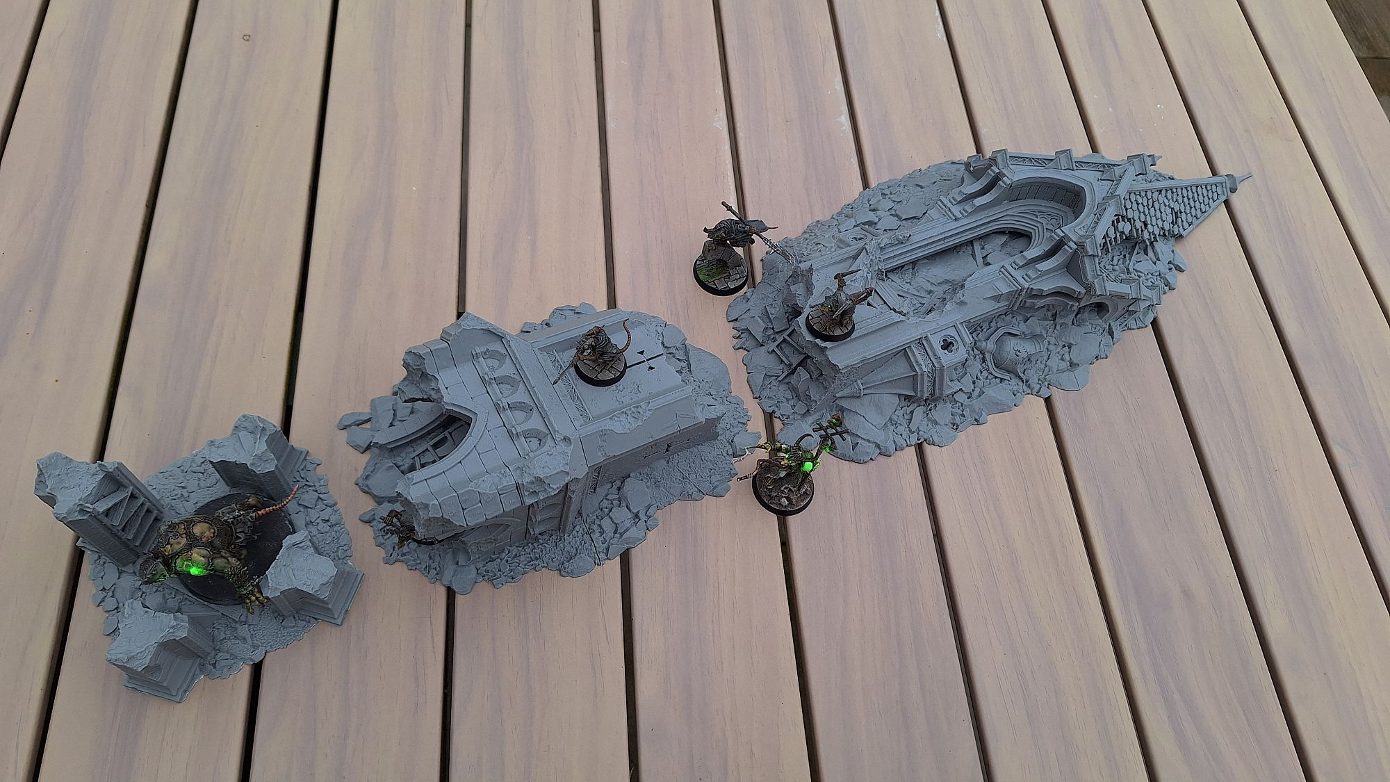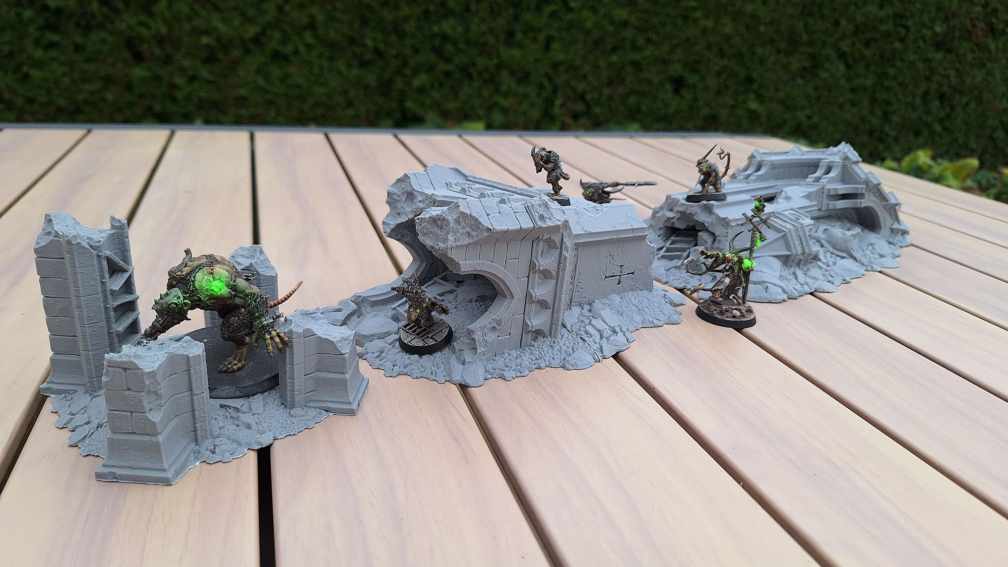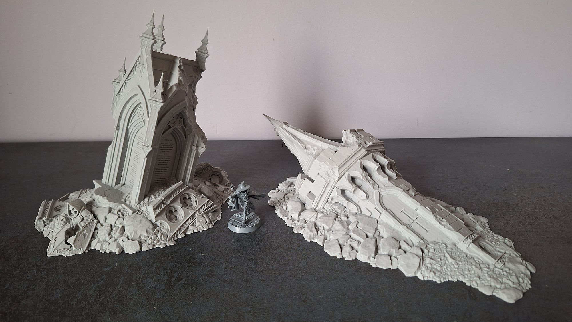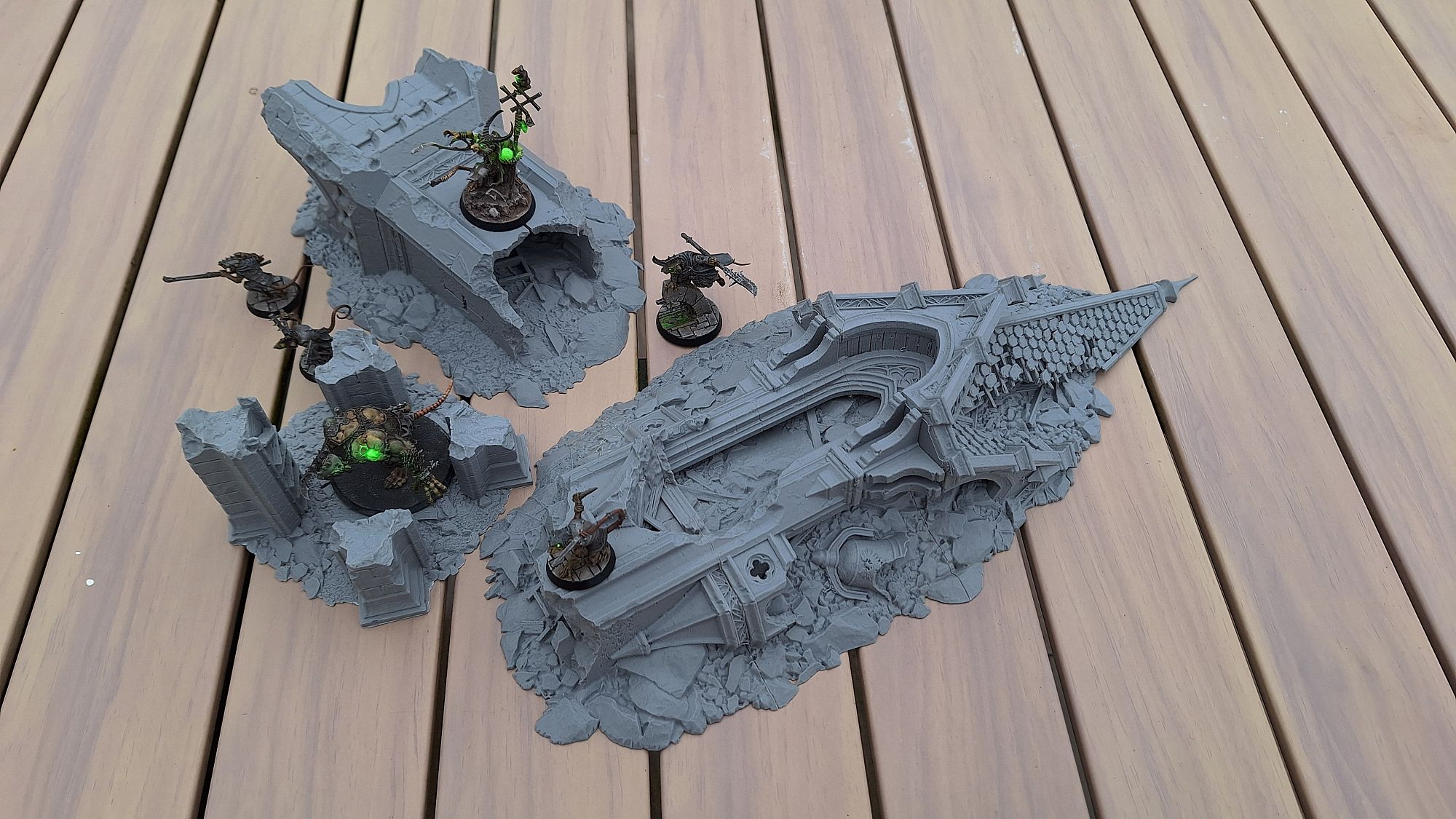 A collection of gothic ruins scatter terrain from the Stormcrow City - The Silent District campaign - no supports required
