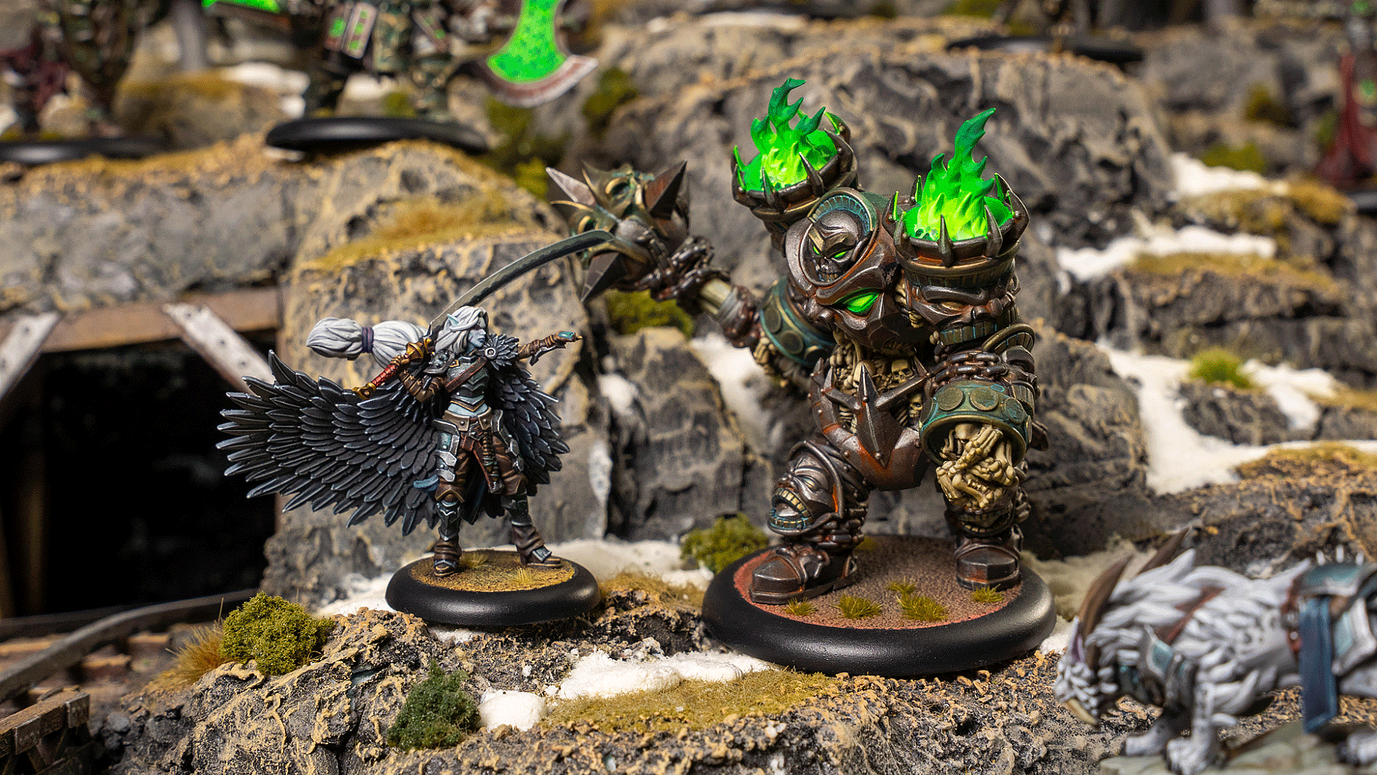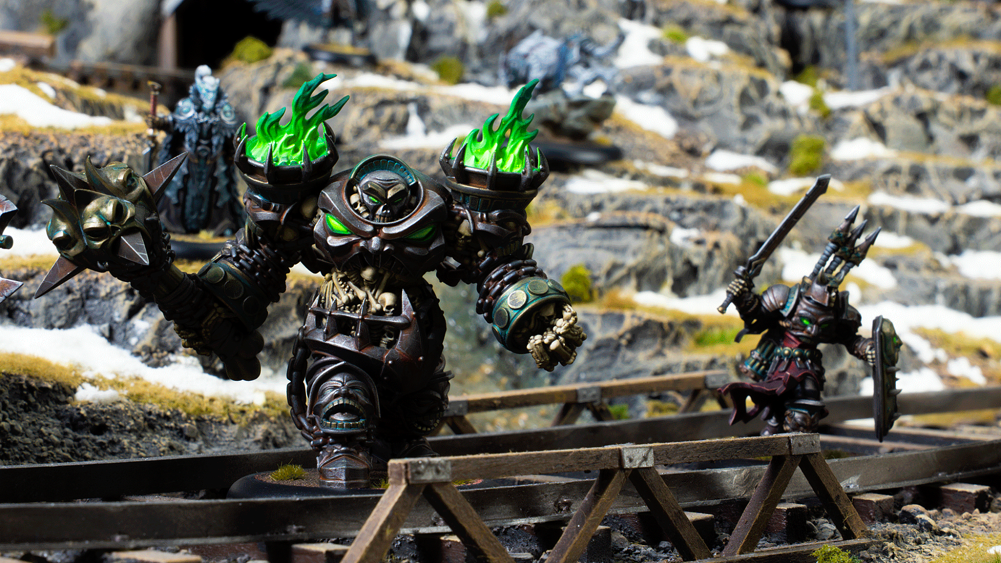 The Revenant Champion strides at Anathia’s side — a fearsome relic of the first Orgoth Invasion restored to grim purpose. The Barrow Ghoul lumbers behind them, an infernal-built altar of bone and iron animated by dark sorcery.