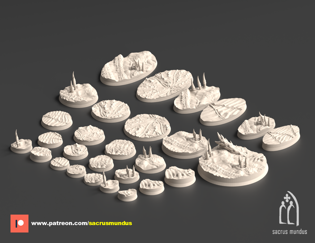 -Round Base Set: 28 STLs, 5 models of 25mm round bases, 2 models of 28mm round bases, 5 of 32 mm round bases, 5 of 40 mm, 2 of 50 mm, 2 of 60 mm, 1 of 90 mm, 2 models of 75x42 mm, 2 models of 60x35 mm and 2 models of 90x53 mm oval bases-- Optimized for SLA/DLP resin printers