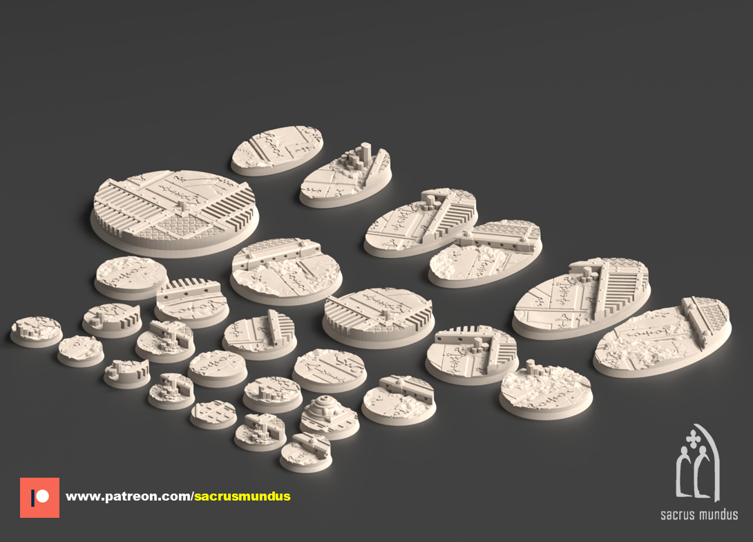 -Round Base Set: 28 STLs, 5 models of 25mm round bases, 2 models of 28mm round bases, 5 of 32 mm round bases, 5 of 40 mm, 2 of 50 mm, 2 of 60 mm, 1 of 90 mm, 2 models of 75x42 mm, 2 models of 60x35 mm and 2 models of 90x53 mm oval bases-- Optimized for SLA/DLP resin printers