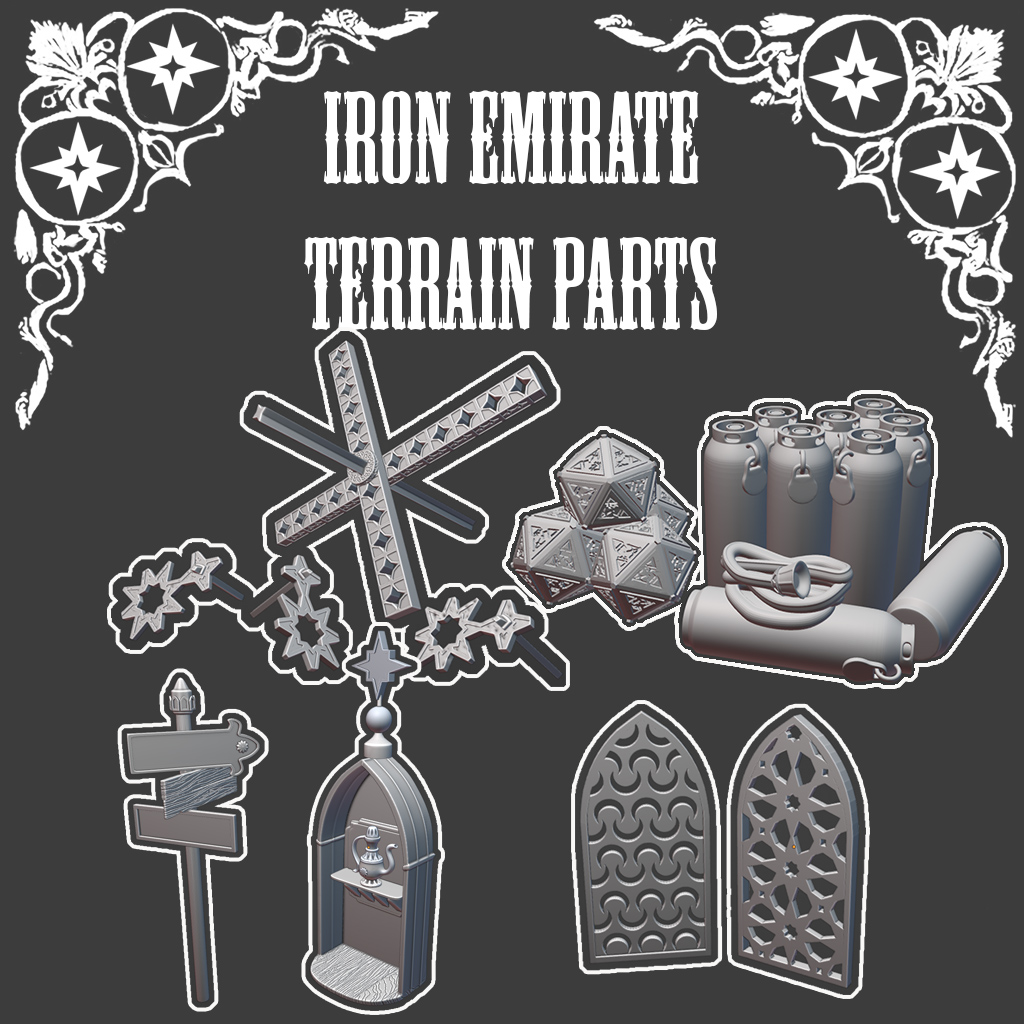 Contains 104 individual files from the four existing small parts packs sold seperately. This is intended for outfitting terrain at 35mm scale. Intended for grimdark crusading middle eastern trench factions.