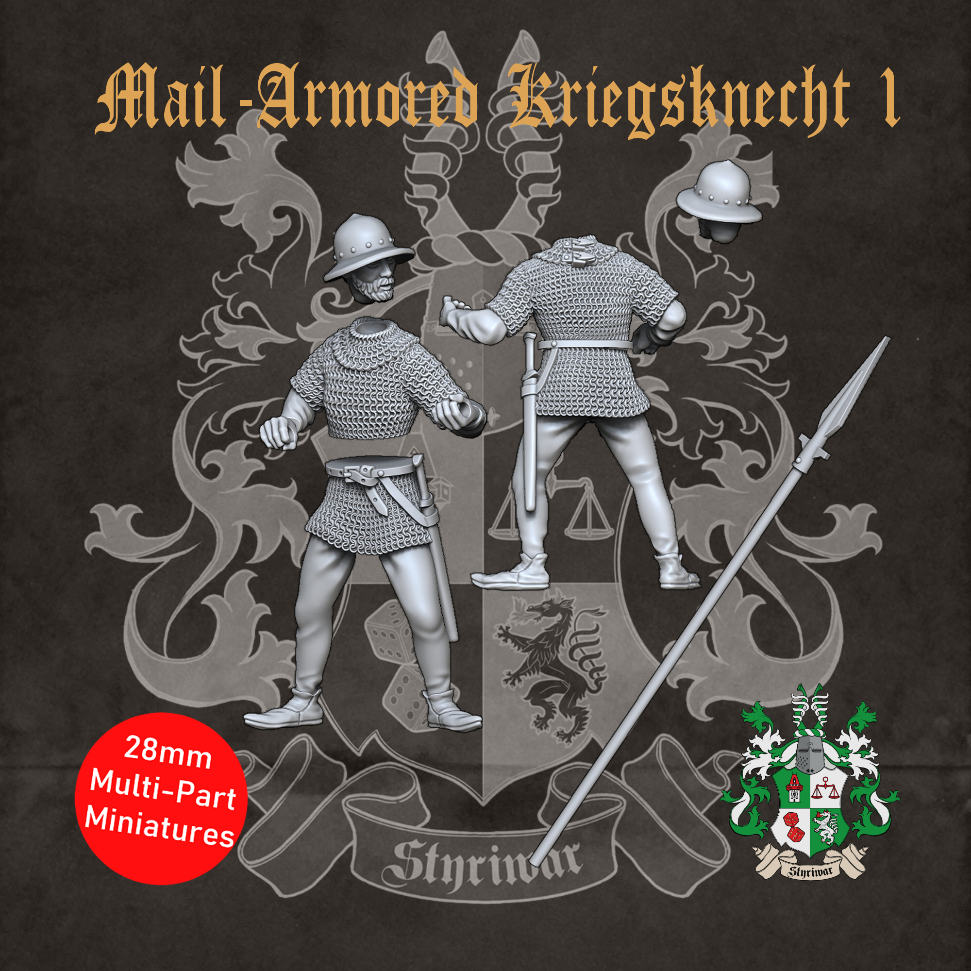 With these files you can print a MULTI-PART 28mm Late Medieval European Mercenary for the period of the 1450s to roughly 1500. He's wearing an Italian late 15th century styled broad-brimmed Kettle Helmet, is equipped with a winged spear and wears a baselard, ring-mail and mail-standard.