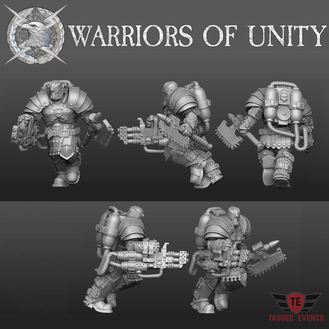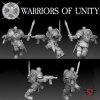 A sample of 1 Warrior from each of the three different Cohorts, 32mm Sci-Fi Roman models armed with gunglaive and shields, gladius and machine gun, flamer and chainaxe. Note: the shields shown in the individual poses are early renders, the actual shieds are shown on the group shot and in the dedicated shield image.